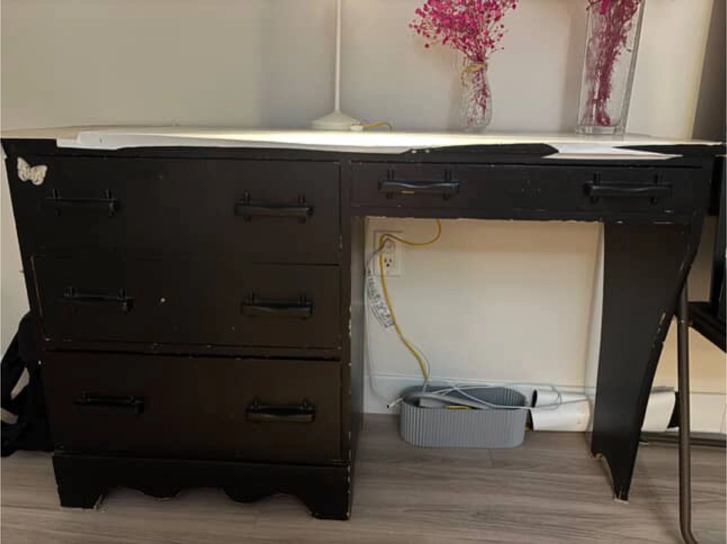 Selling a black wooden desk. It has a few drawers for storage and a good amount of surface area. It's perfect for a student or anyone who needs a dedicated workspace in their home. It's in used condition, but still has a lot of life left in it.