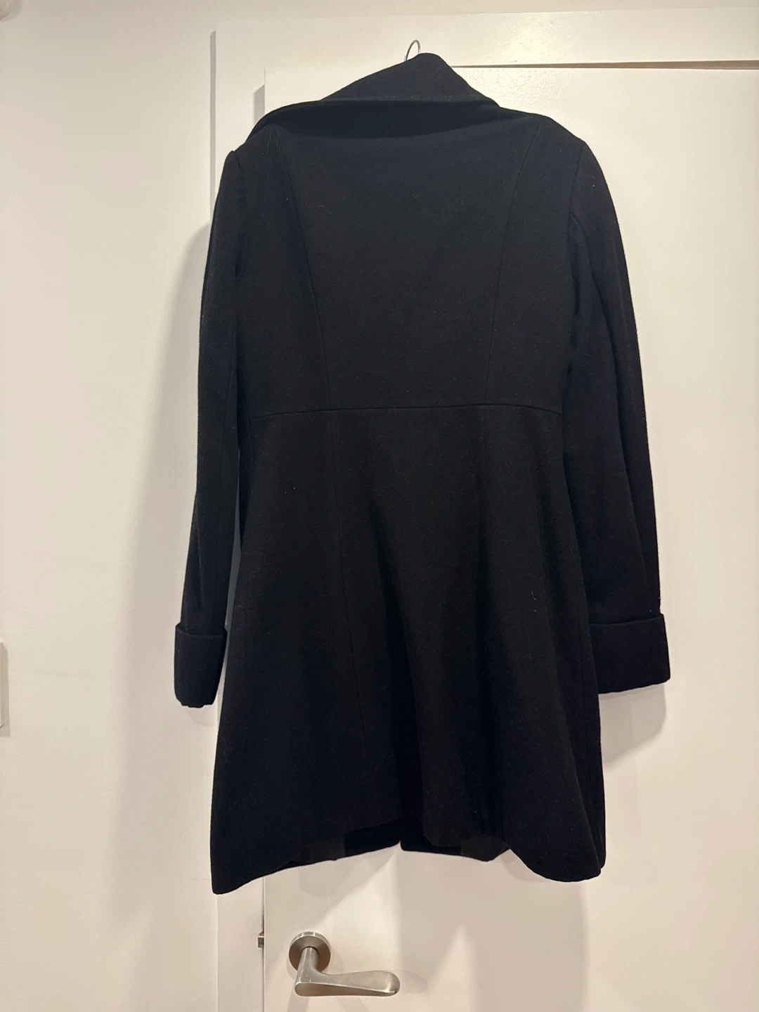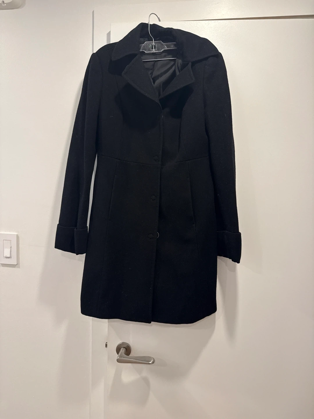 Selling a stylish black coat. It's a wool blend, making it perfect for cooler weather. A classic addition to any wardrobe!