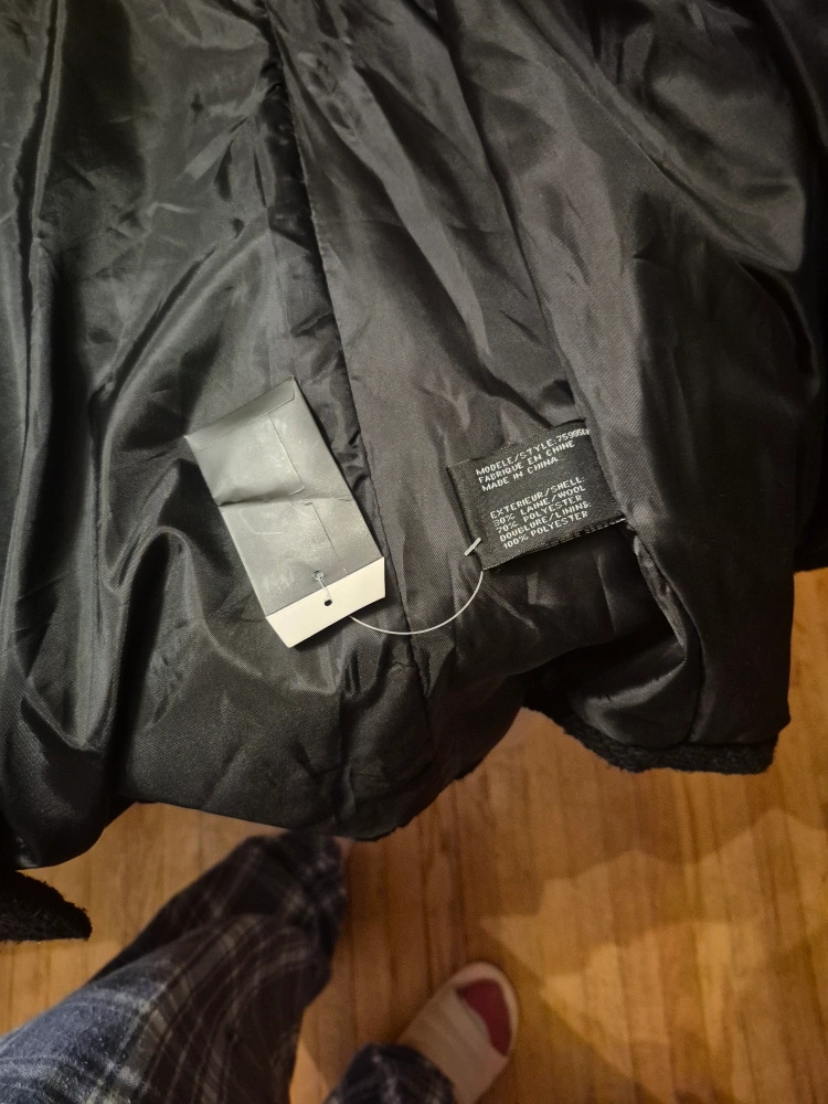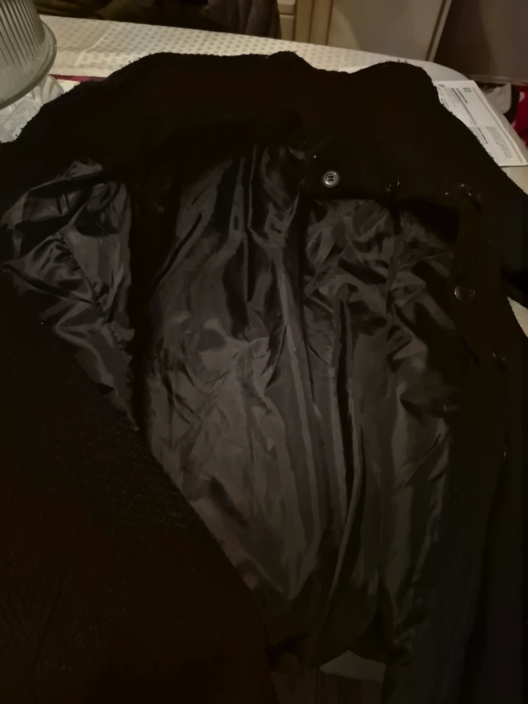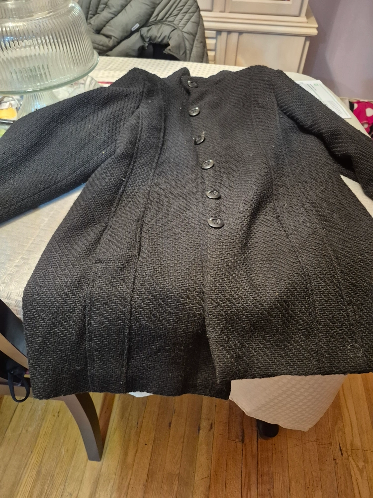 113Classic black coat, perfect for cooler weather! It's a size small and made from a wool blend, so it’s sure to keep you warm. The lining is a sleek black polyester and wool front brand new fixed price