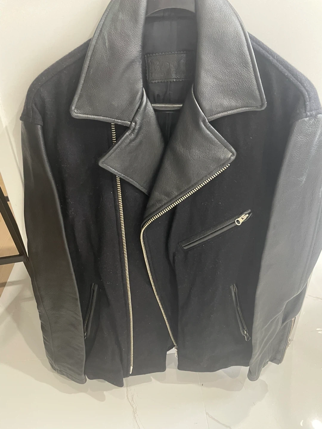 65Selling a stylish black leather Roots biker jacket! It features a wool body with leather sleeves and trim. Perfect for adding an edgy touch to your wardrobe . Leather has some scratches