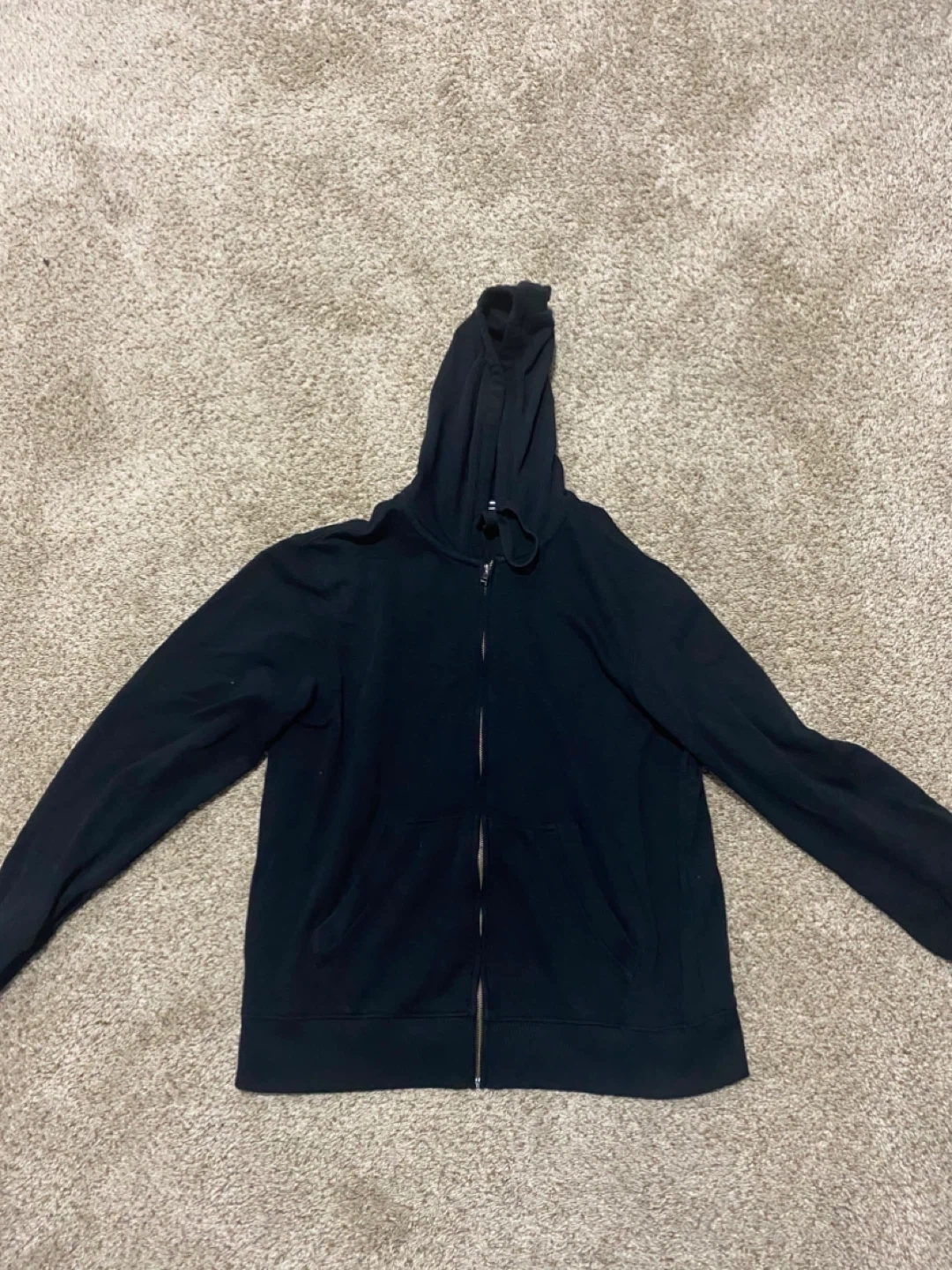 Selling a cozy black zip-up hoodie! It's a great basic to have in your closet for layering or just lounging around. In good condition and ready for a new home and size is large