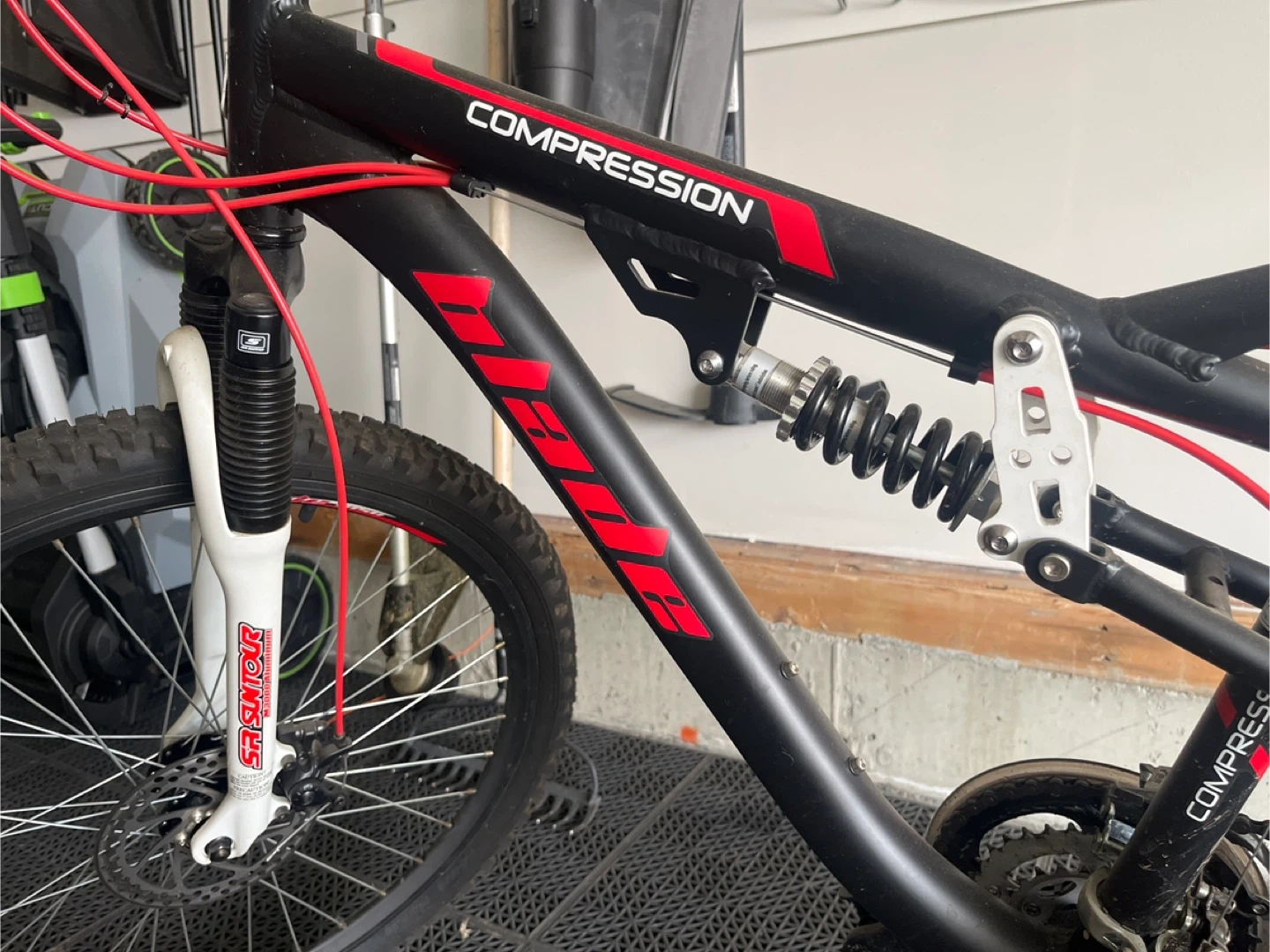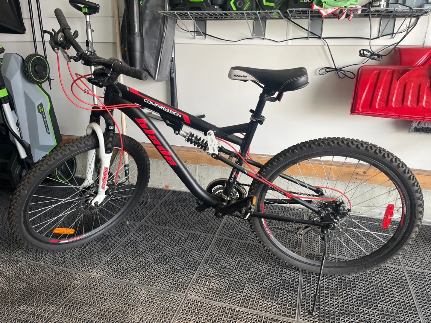 85Selling a Blade Compression mountain bike. It's in good condition and ready for some trails or just cruising around the neighbourhood. The black and red colour scheme looks great, and it's a sturdy bike. Feel free to ask any questions!