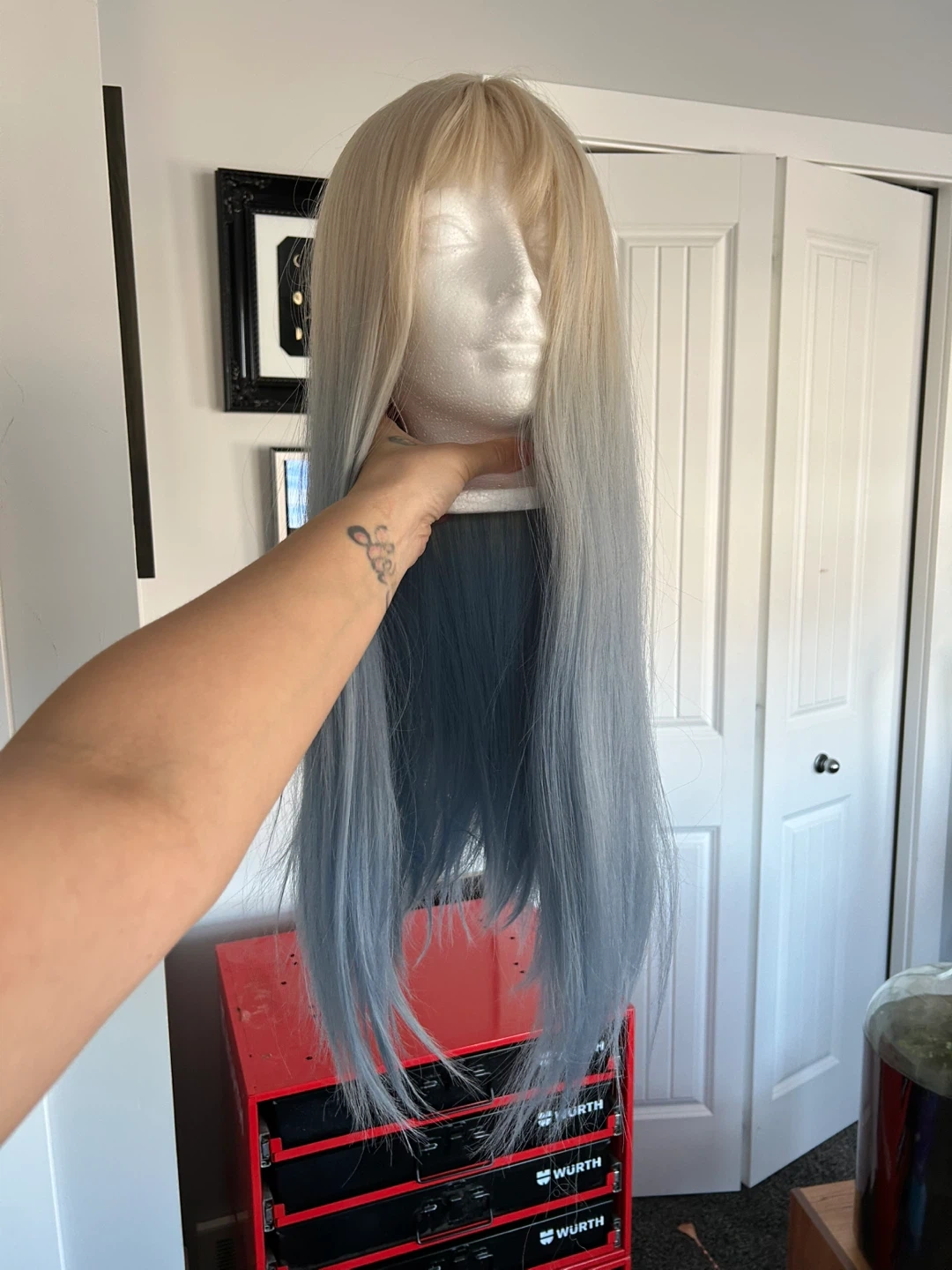 Selling a blonde to blue ombre wig. It has a natural looking gradient and is in great condition! The wig has clips inside for a secure fit