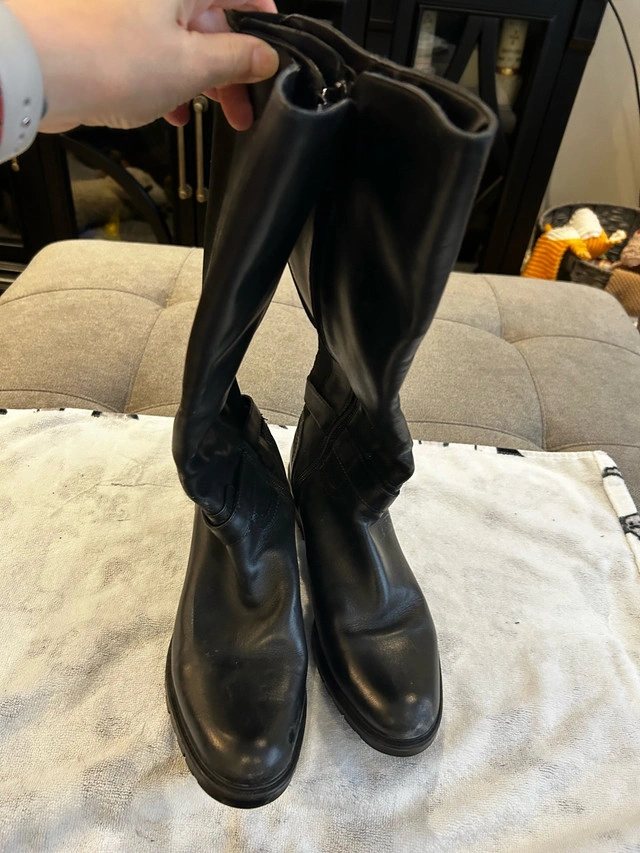 163Pair of women's black leather riding boots. Side zipper closure. Good condition. Size 8.5. Let me know if you're interested!