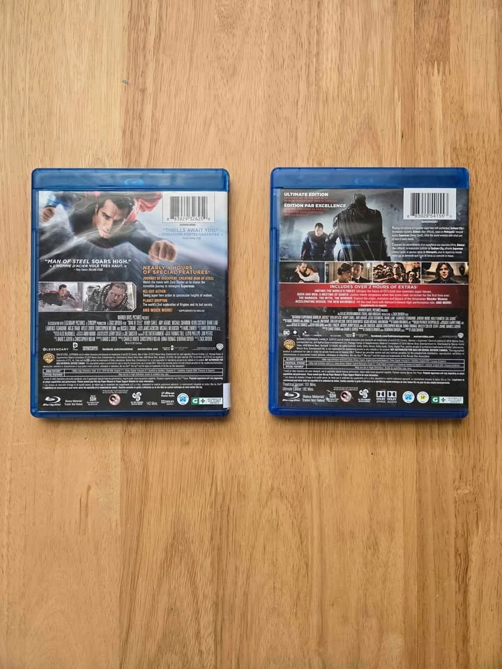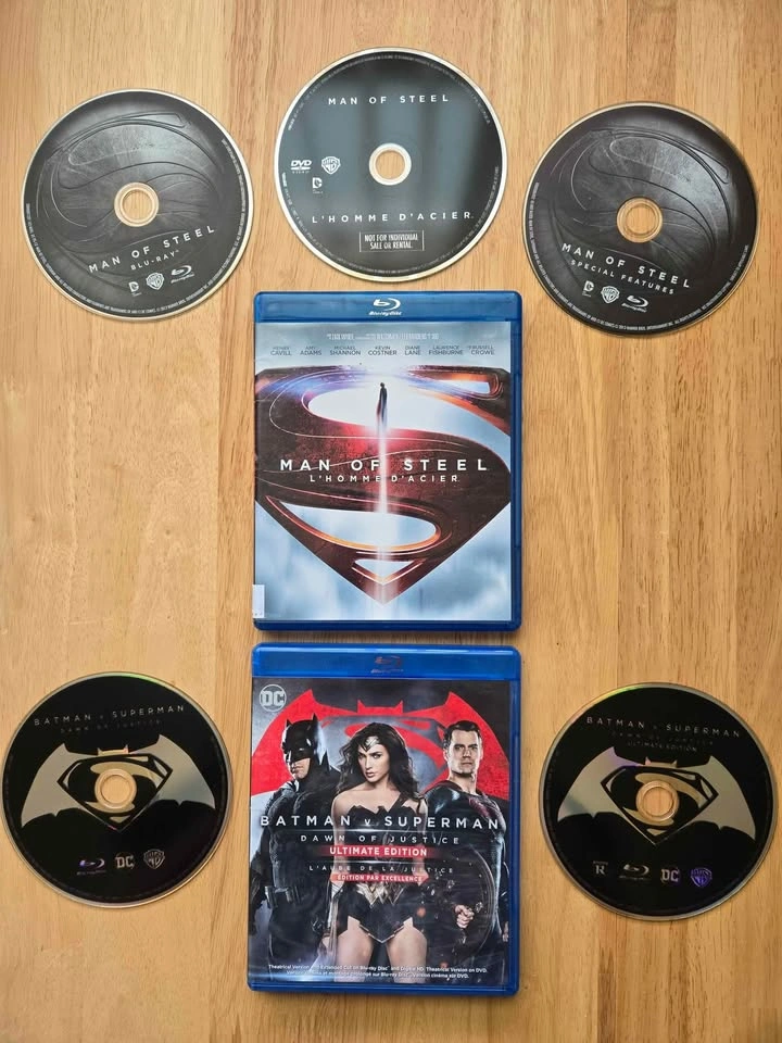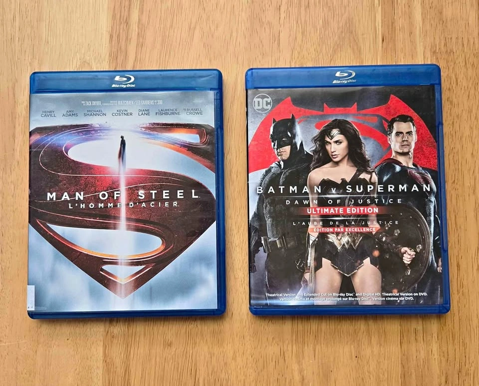 76Blu-ray DC Superhero Genre Titles $8 each or Both for $15 Man of Steel (2013) Action, Adventure, Sci-Fi, and Fantasy genre, centering on the origin story of the DC Comics superhero, Superman. *3 Disks: Blu-ray, Special Features and DVD Batman v Superman: Dawn of Justice (2016) American Superhero film. Its primary genres are, Action, Adventure and Sci-Fi. *2 Disks - Blu-ray English/French, and Blu-ray Ultimate Edition. * Both movies are gently used, cases intact, and all disks are in mint condition with no scratches. $8 each or both for $15. Cash is preferable. Exact payment Only (No change) EMTs welcome. PICKUP Only, Weston area. Comes from a clean, bug free, smoke free, kitty friendly home. Willing to meet curbside. Pls check out my other Blu-ray listings. Stay tuned for more posting...