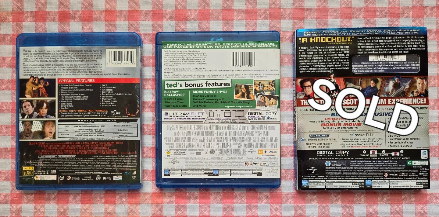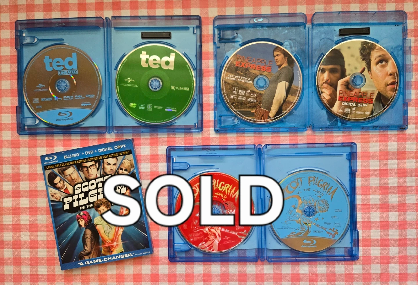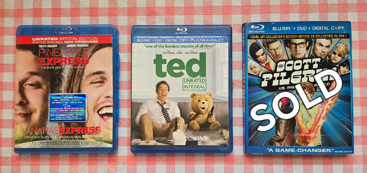 77Blu-ray and DVD Format, Comedy Titles "Pineapple Express" - 2008 American buddy stoner action comedy Theatrical/extended versions - unrated + special edition Disk #1 Blu-ray format + Special features Disk #2 DVD format "ted" - 2010 American fantasy buddy comedy film. Disk #1 Unrated/theatrical versions Disk #2 DVD format ** SOLD ** "Scott Pilgrim vs. the World" - 2010 romantic action comedy film, based on the graphic novel series Scott Pilgrim by Bryan Lee O'Malley. 2 disks - Blu-ray + DVD formats. All 3 movies are gently used, cases and jackets intact. All disks are in mint condition with no scratches. $5 each. No holds. Cash is preferable. Exact payment Only (No change) EMTs welcome. PICKUP Only, Weston area. Comes from a clean, bug free, smoke free, kitty friendly home. Willing to meet curbside.