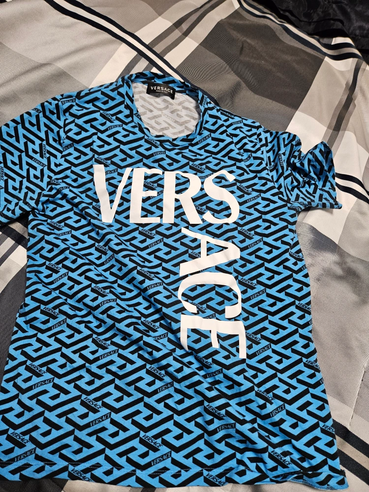 36womens short sleeve t-shirt with blue and black Versace pattern. The t-shirt has a crew neck. There is a white Versace logo on the front.