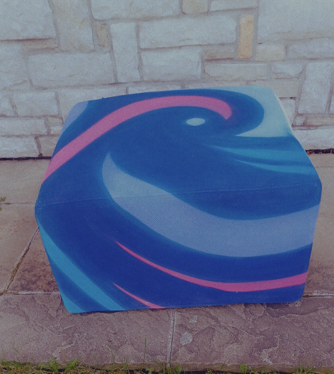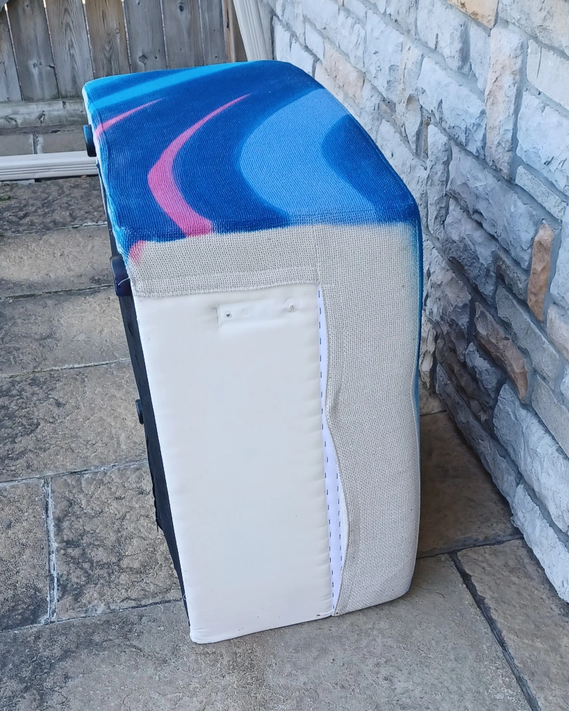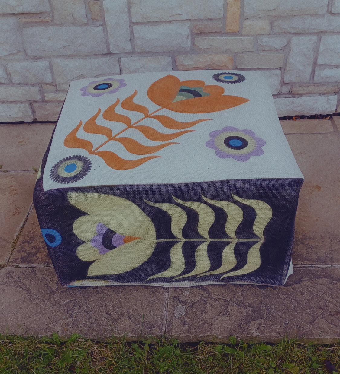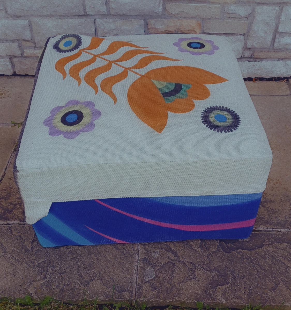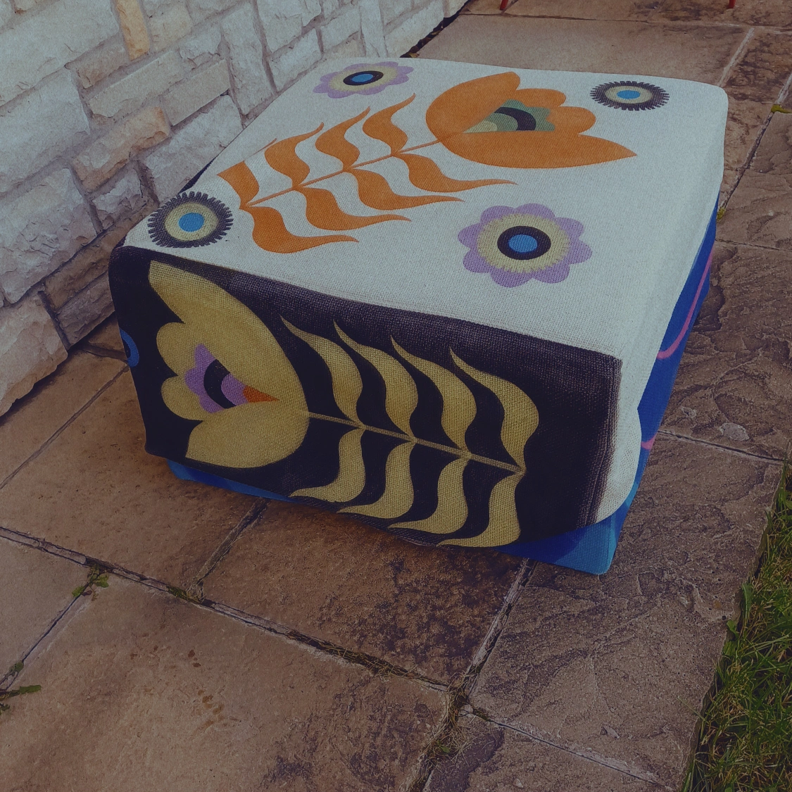 Square storage ottoman with blue and pink patterned fabric. it has a zippered opening on the bottom for storage. you can, but pillows, blankets ... high 16.5' 28.5' square comes with an extra cover sheet . elegant and modern You can use it in the living room, patio, or children's room. Location Eastmall and Rathburn
