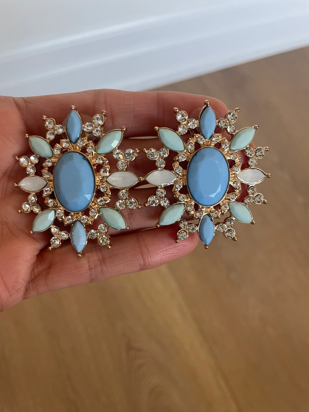 35Large statement earrings. Features blue and white stones and a gold setting. Wore only once for two hours