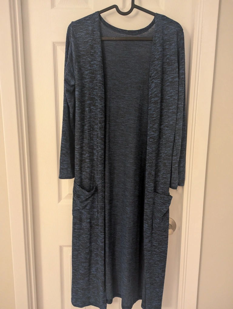 Blue, thin, Long sleeve cardigan with pockets. can fit upto large frame.