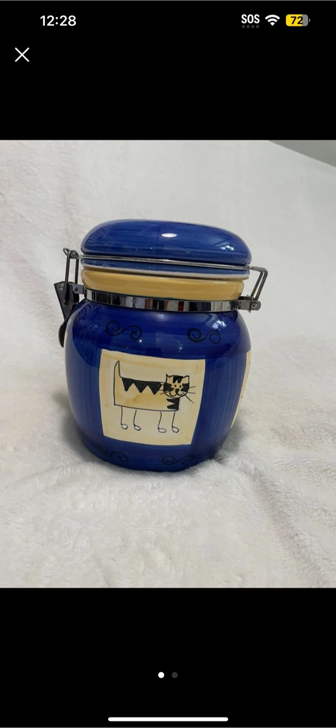 This is a cute blue ceramic jar with a fun cat design. It's perfect for storing small items or adding a touch of whimsy to your kitchen. The jar is in great condition and features a secure lid to keep contents fresh