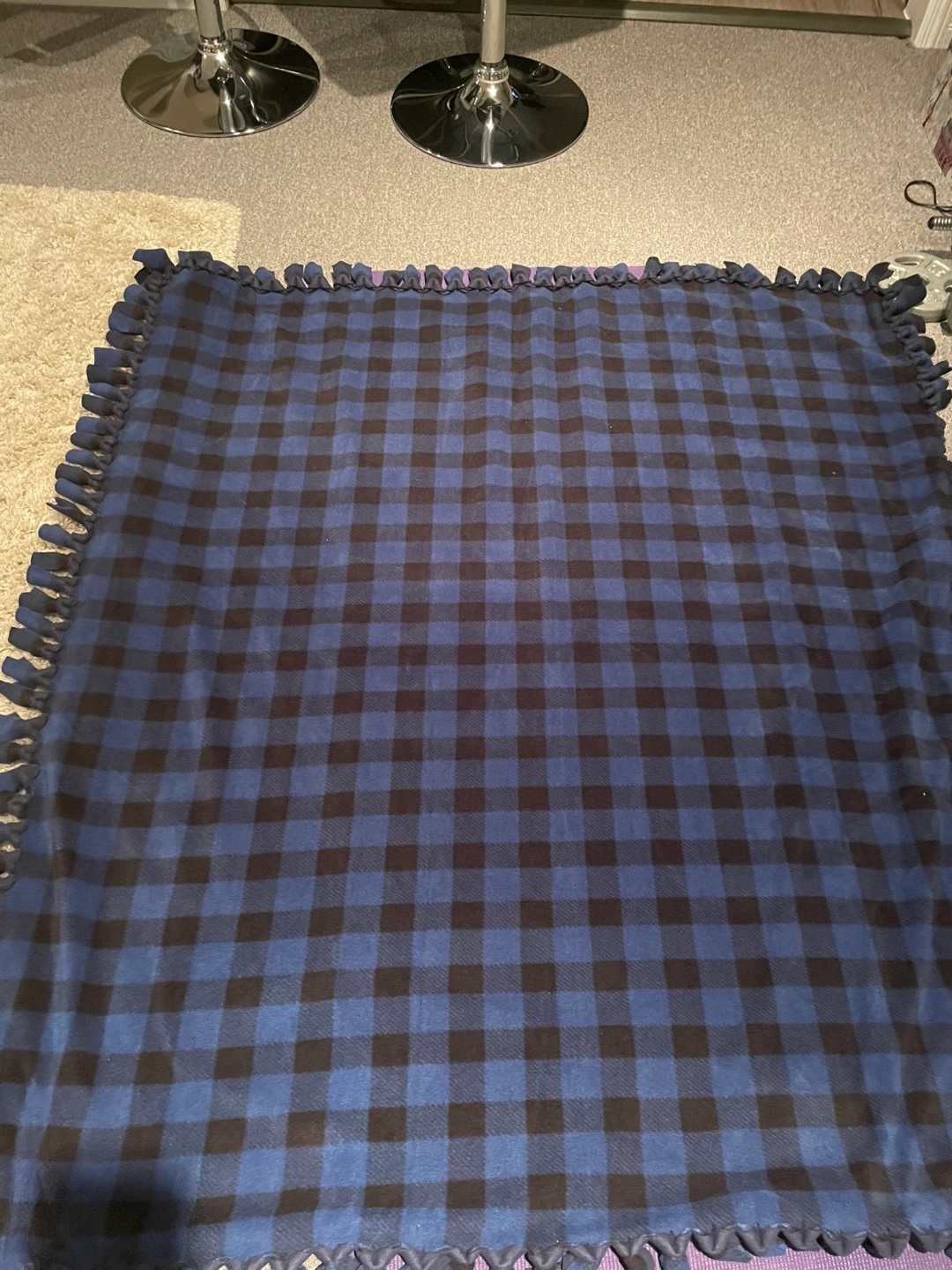 159Features a blue and black checkered design. A dark blue fleece backing. The edges have tied fringe detailing. Such a comforting blanket is great for relaxing on the couch after a long day.