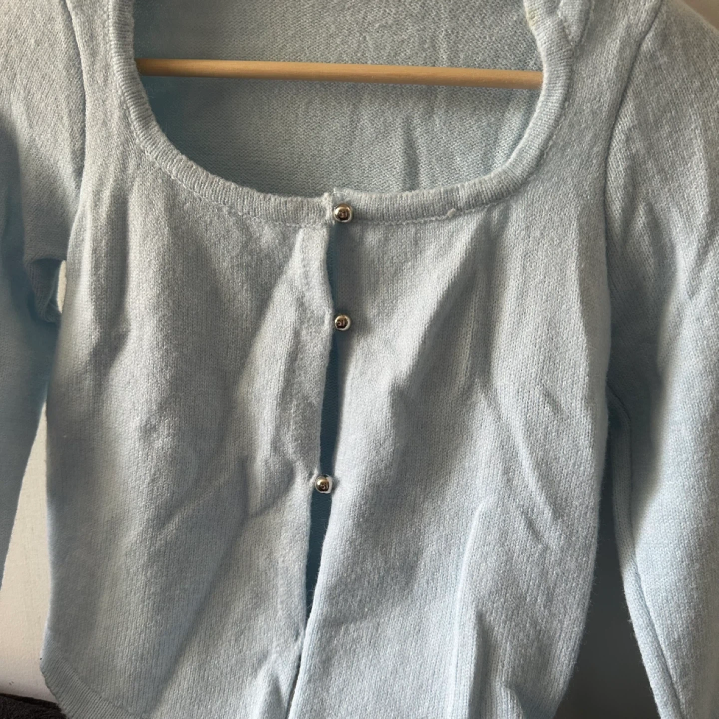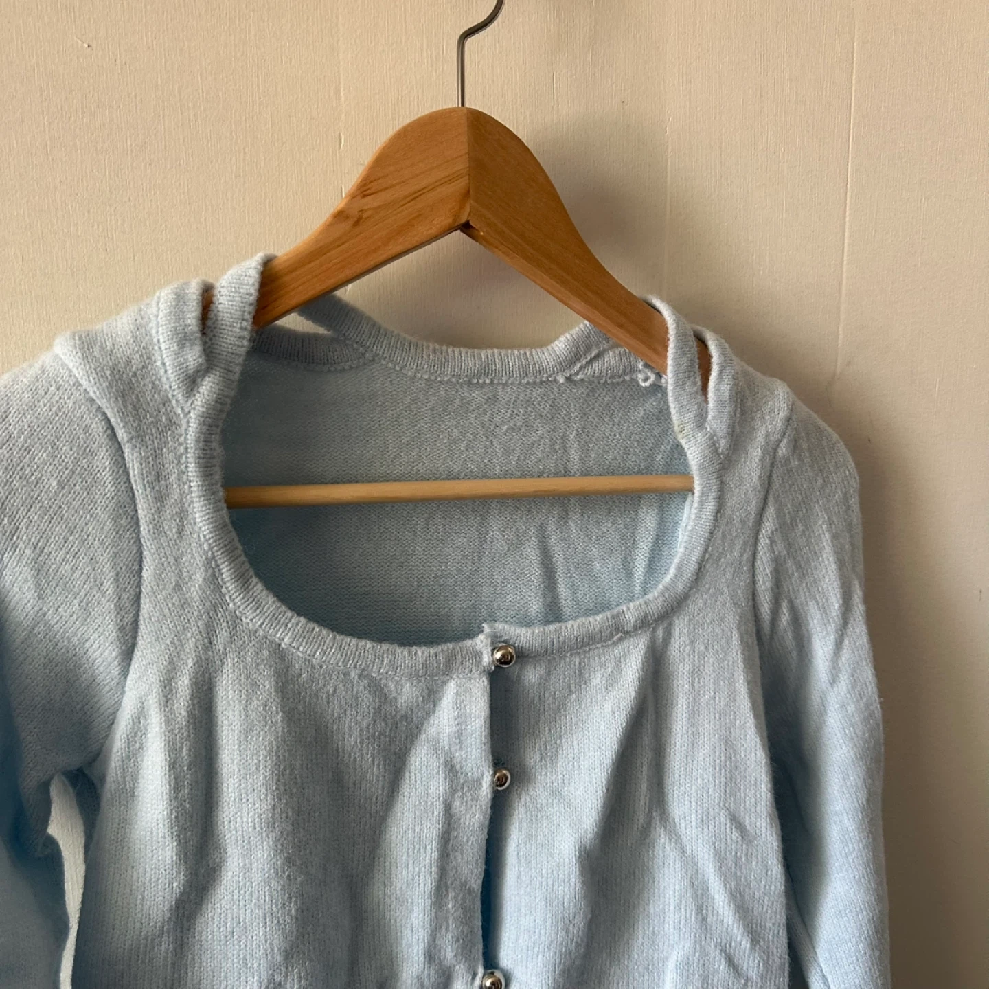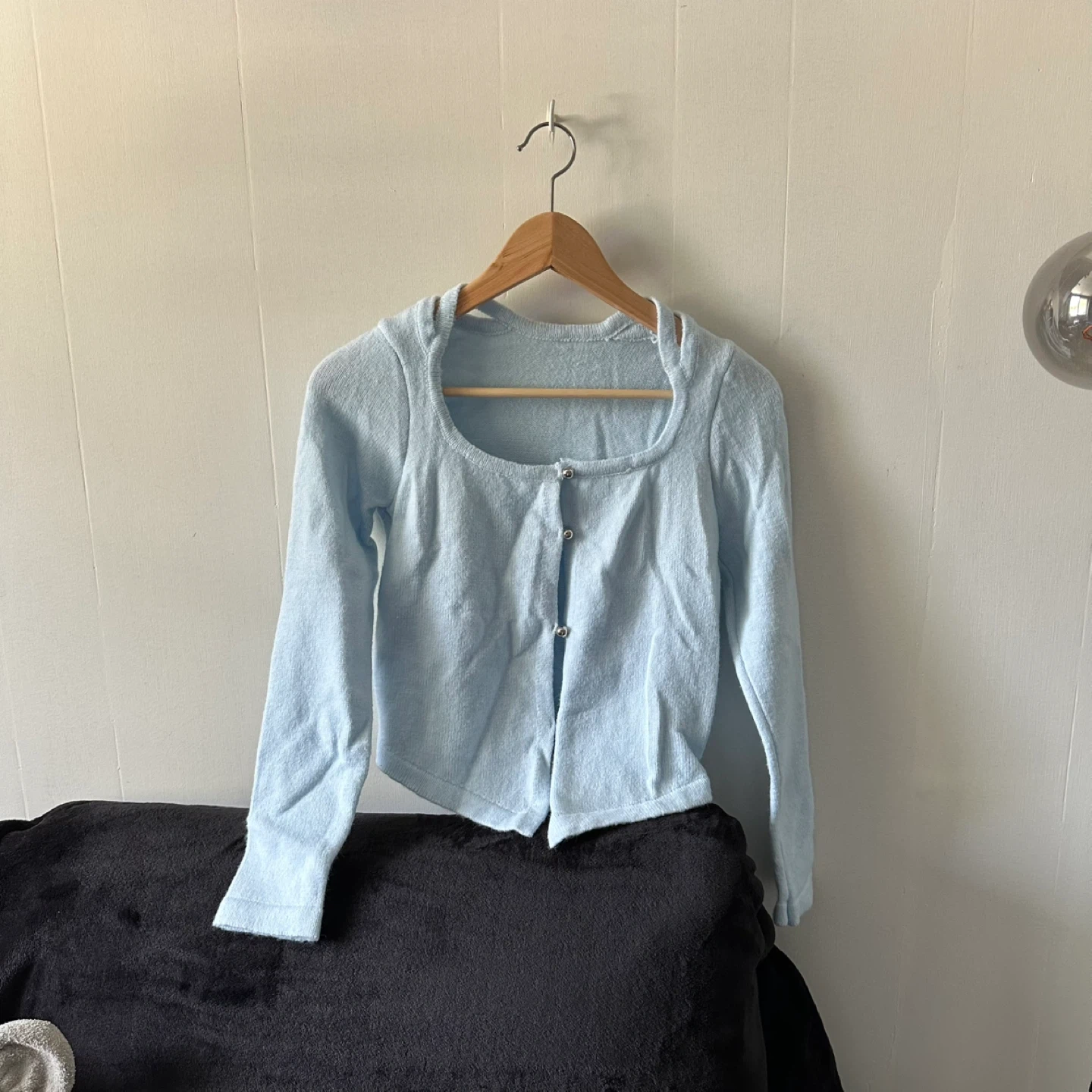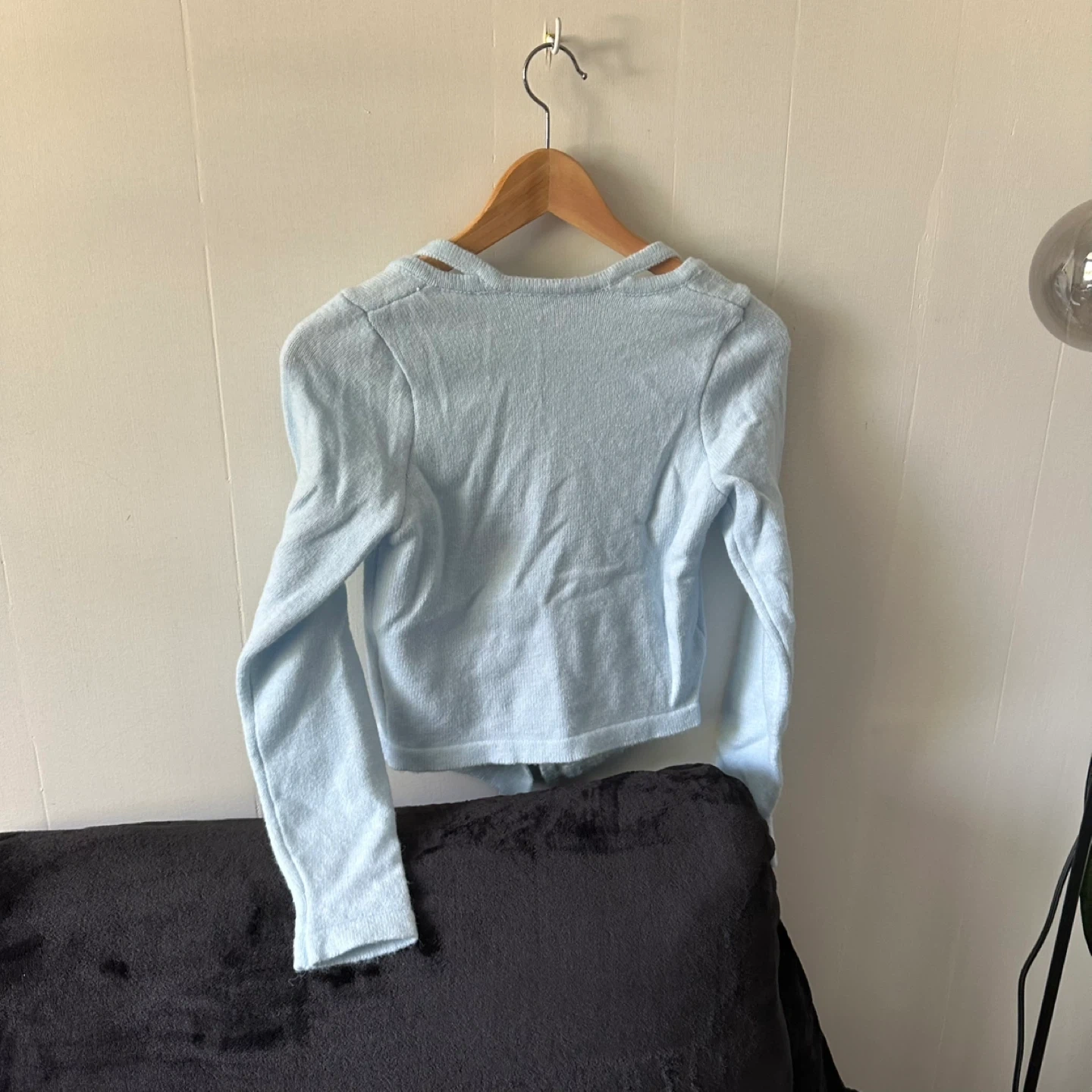 95Blue cropped button-up long sleeve sweater with cutout neckline Fits small light blue, cropped sweater, button-up, long sleeves, cutout neckline, knitted, casual, fitted, pastel, feminine