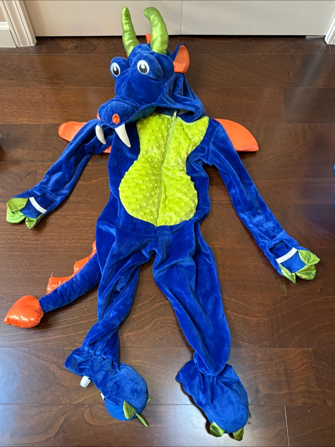 60Brand new , opened but not worn . A fun blue dragon costume! It's in like condition and ready for a new adventure. The costume features vibrant colours and a playful design, perfect for dress-up or Halloween 👻