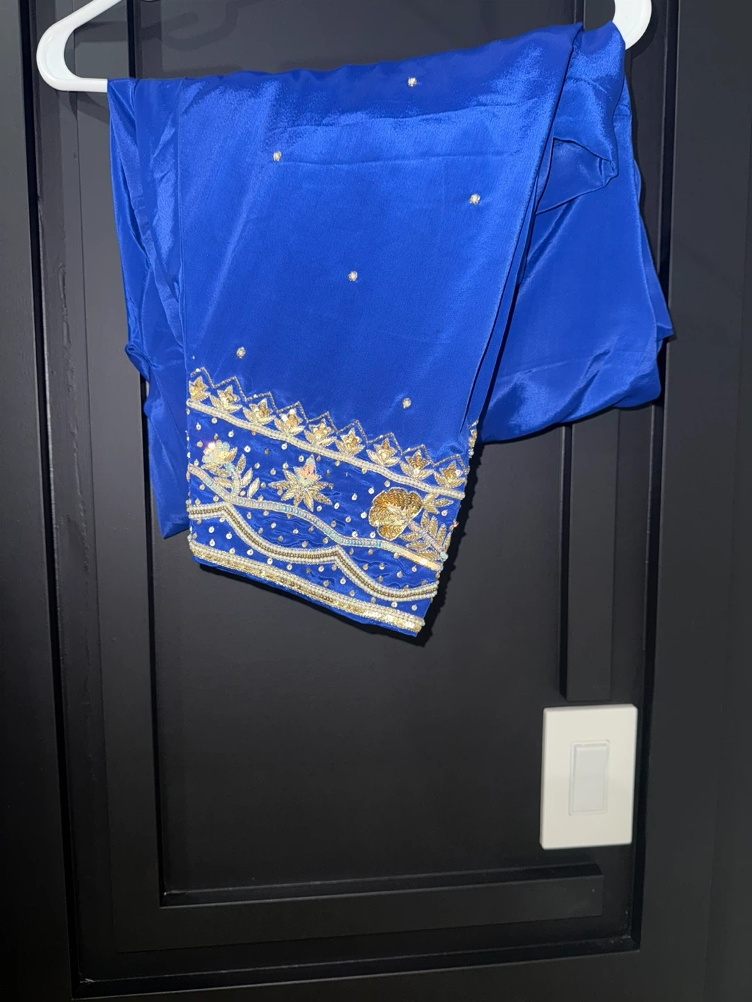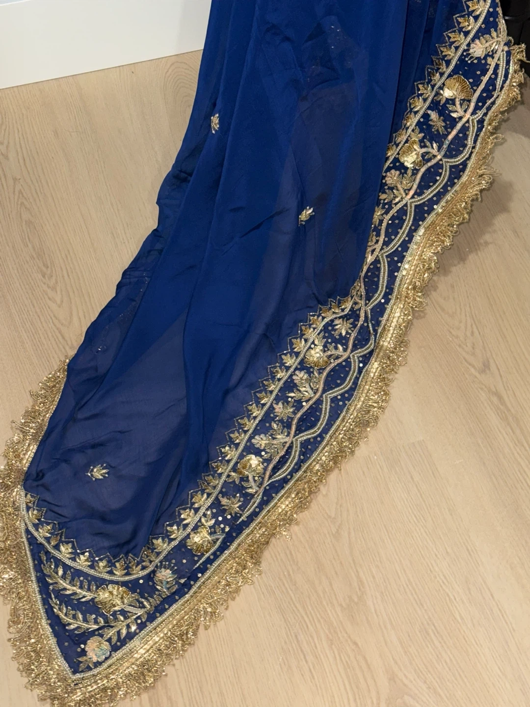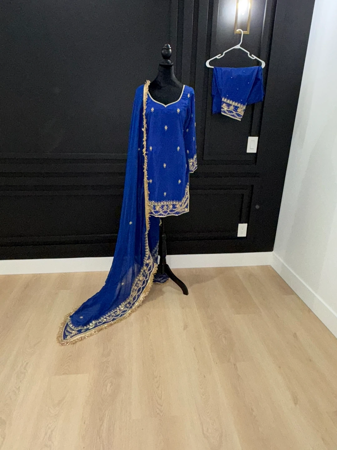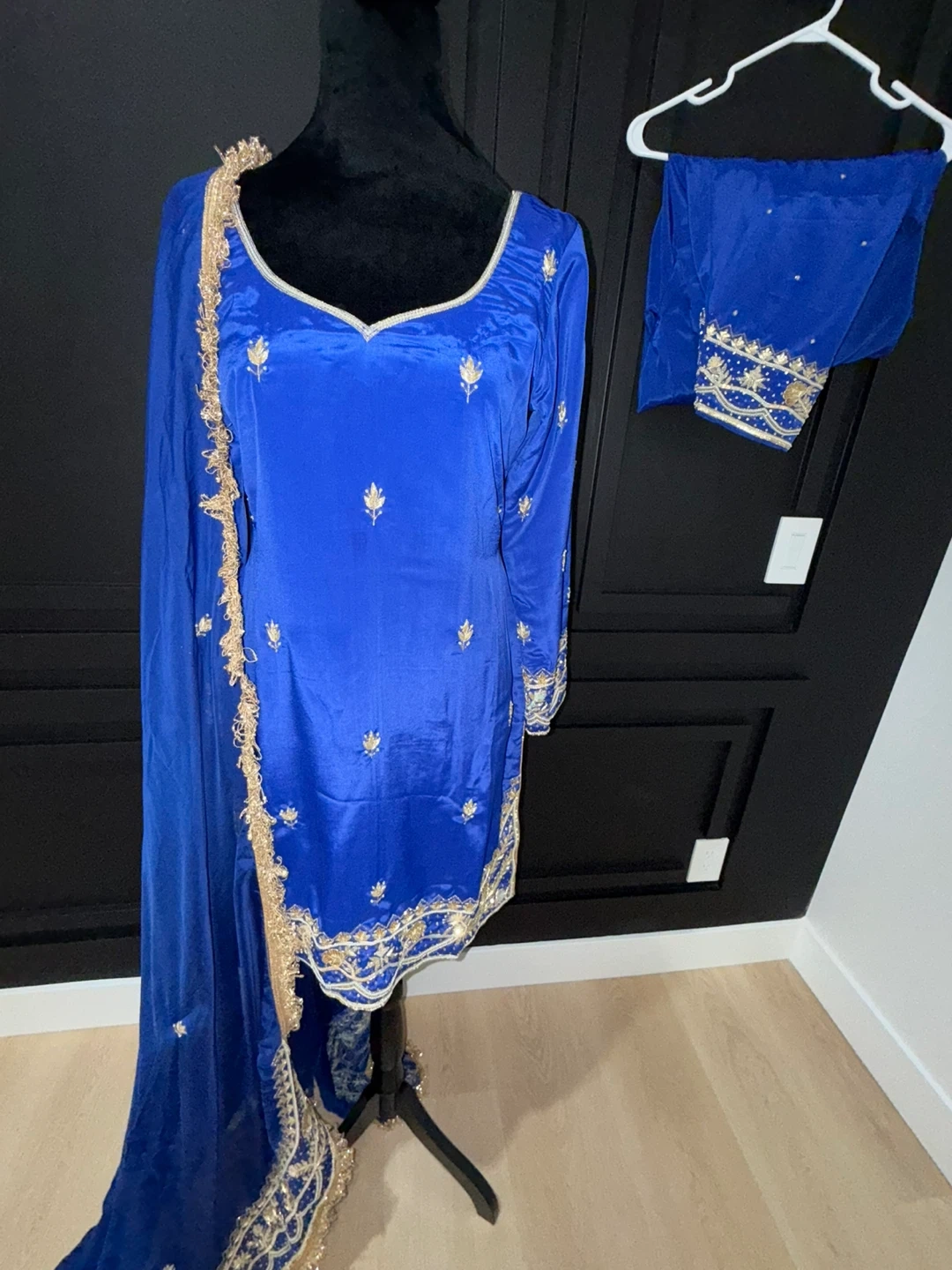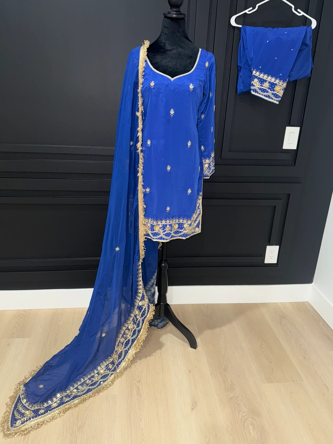 Beautiful blue salwar kameez suit with intricate gold embroidery. Includes the kameez (top), salwar (pants), and dupatta (scarf). Perfect for special occasions!