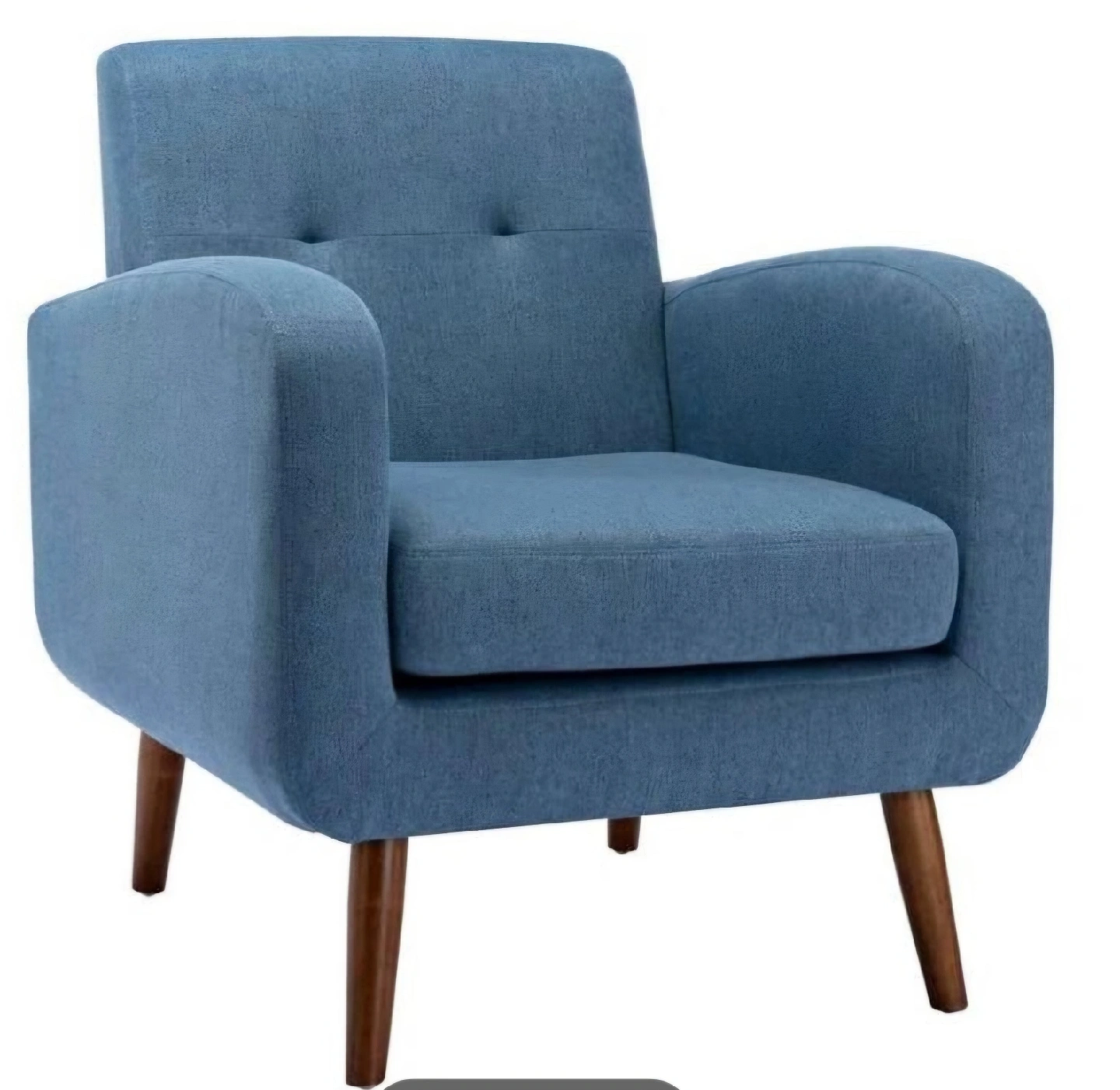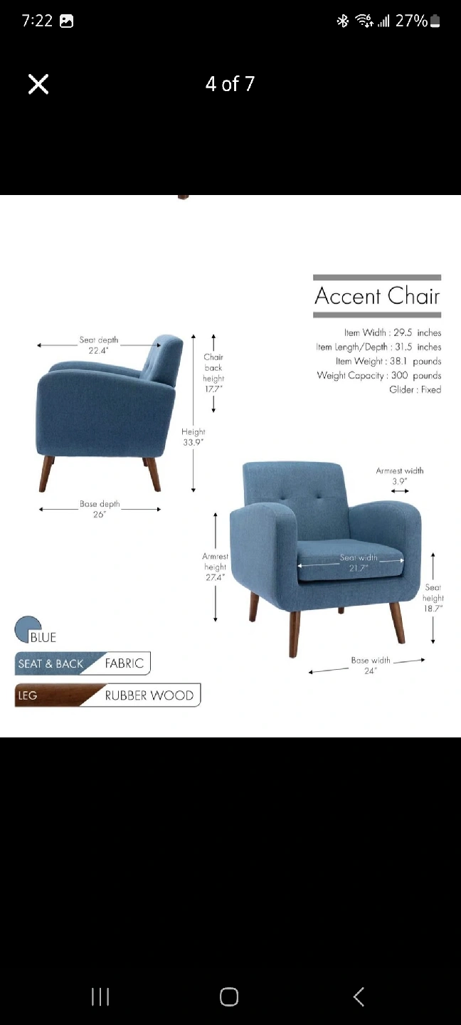 10Selling a comfy accent chair! It's a lovely blue fabric with rubber wood legs. Smoke free, pet free ans stain free Dimensions are: Item Width: 29.5 inches, Item Length/Depth: 31.5 inches, Item Weight: 30 pounds, Height: 33.9 inches