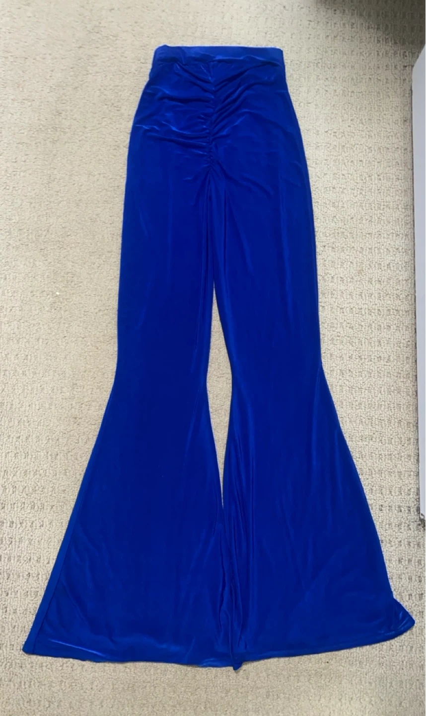 Selling a pair of blue flare pants. They are in great condition and would be a great addition to your wardrobe! Ruche detail at the back. Size small.