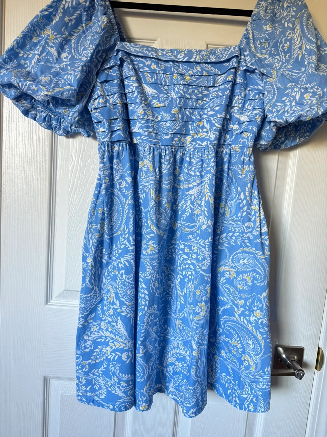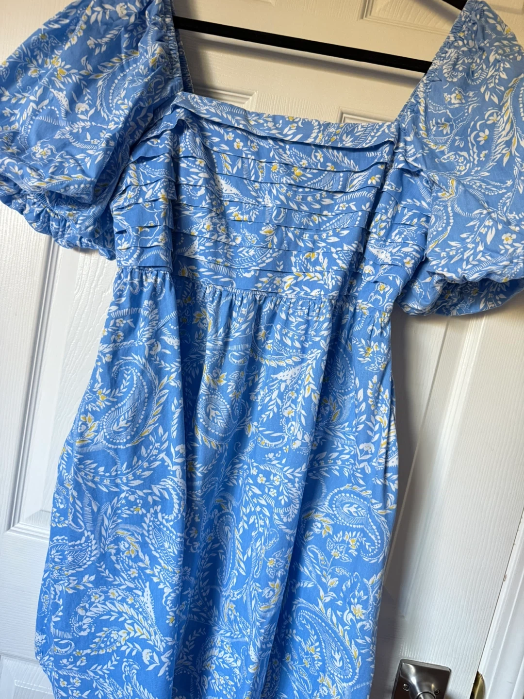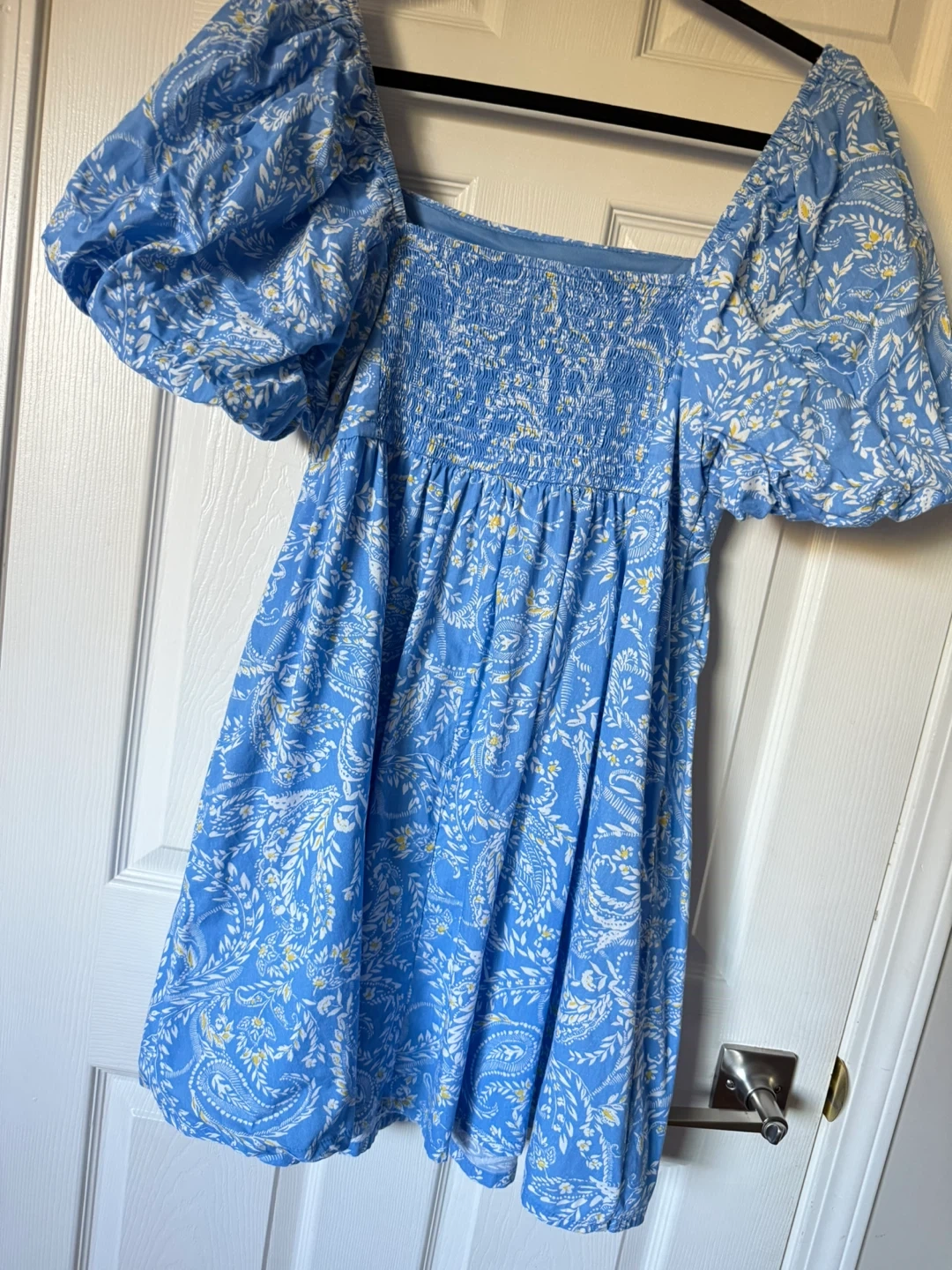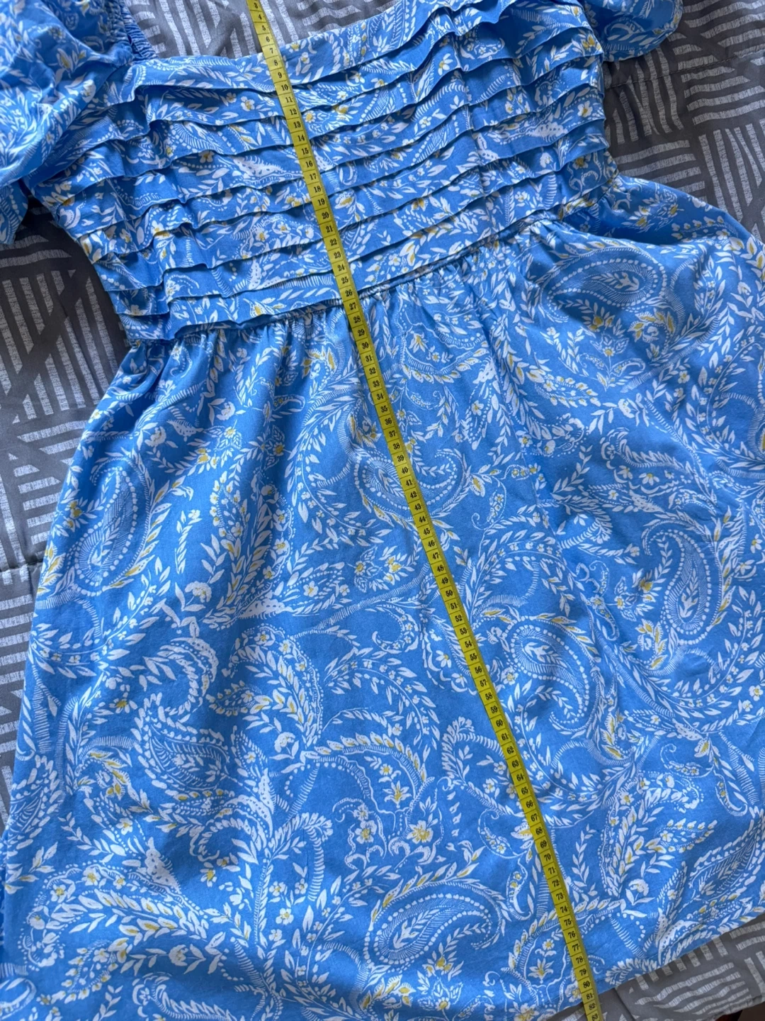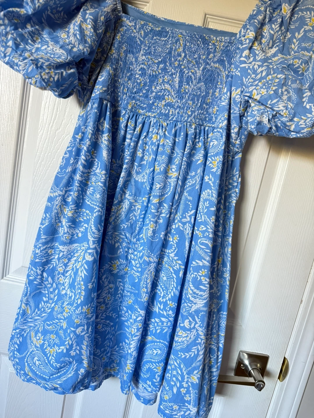 73Cute blue dress with a white and yellow floral pattern. It has a square neckline and short, puffed sleeves. The dress appears to be a size medium, based on the measuring tape in the photos. Great for summer!