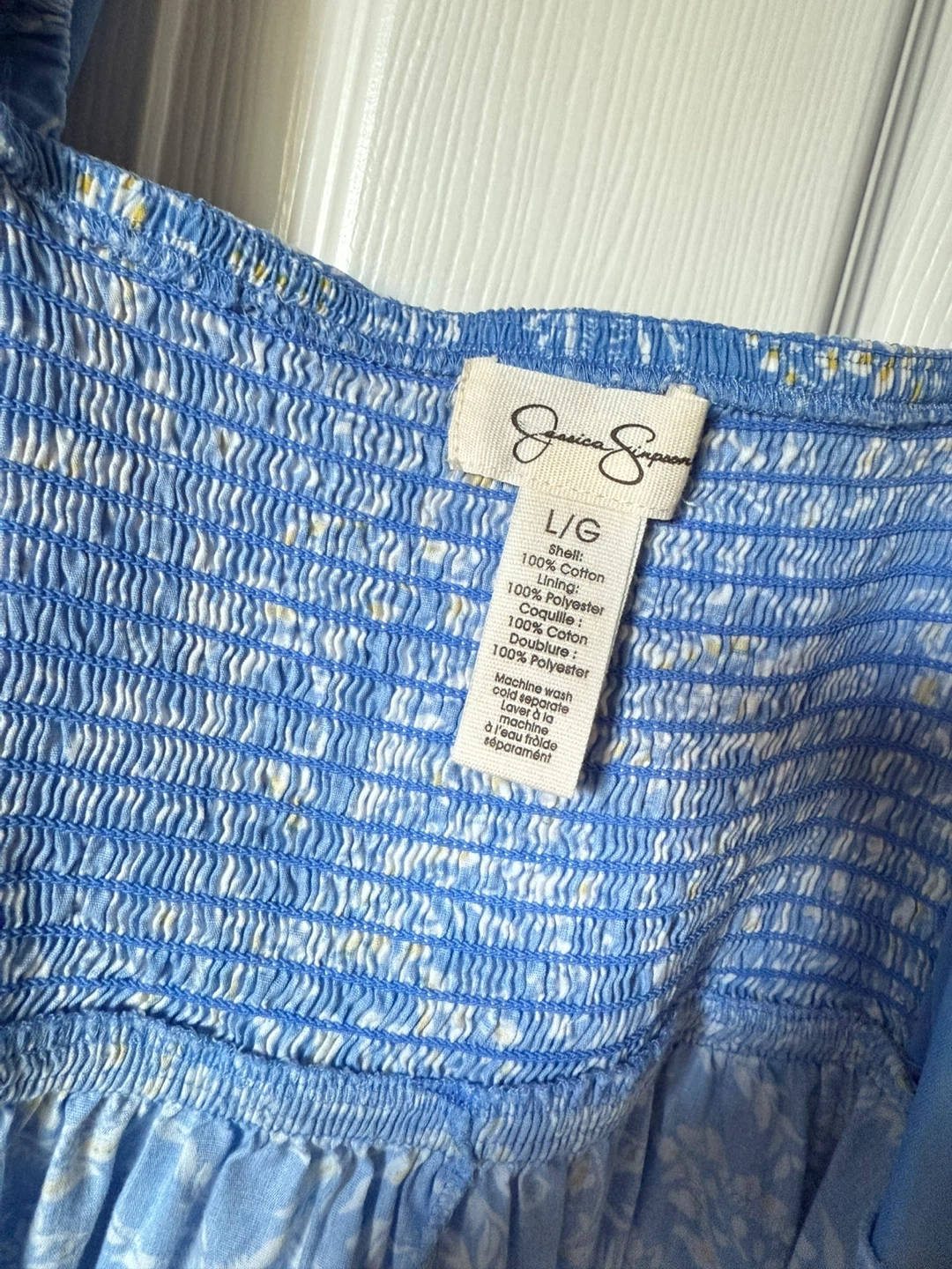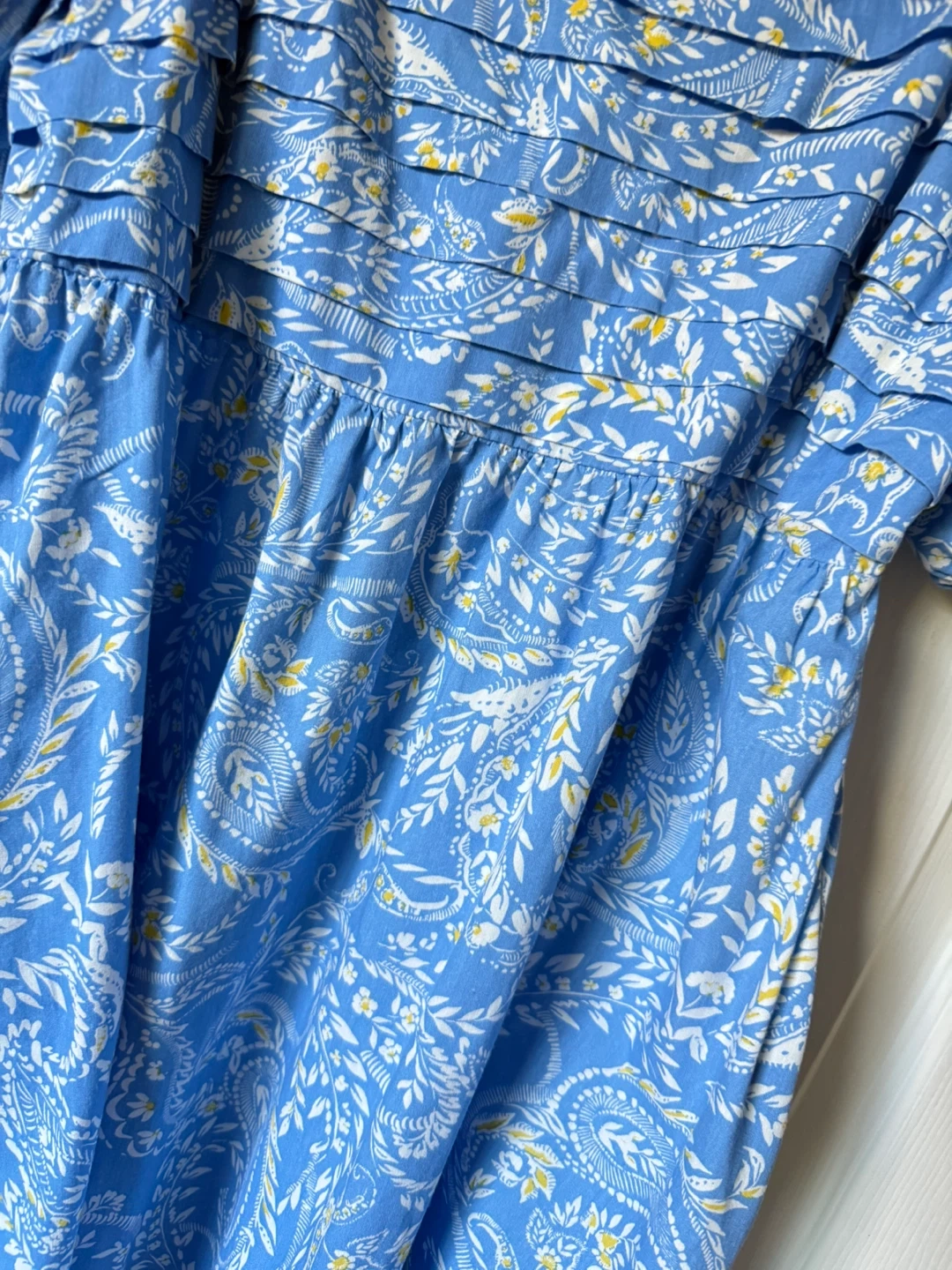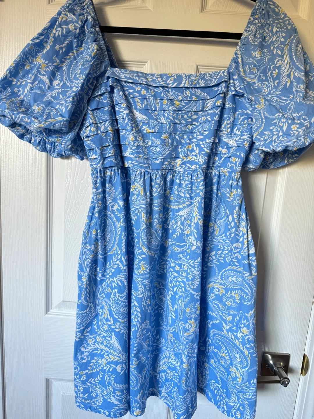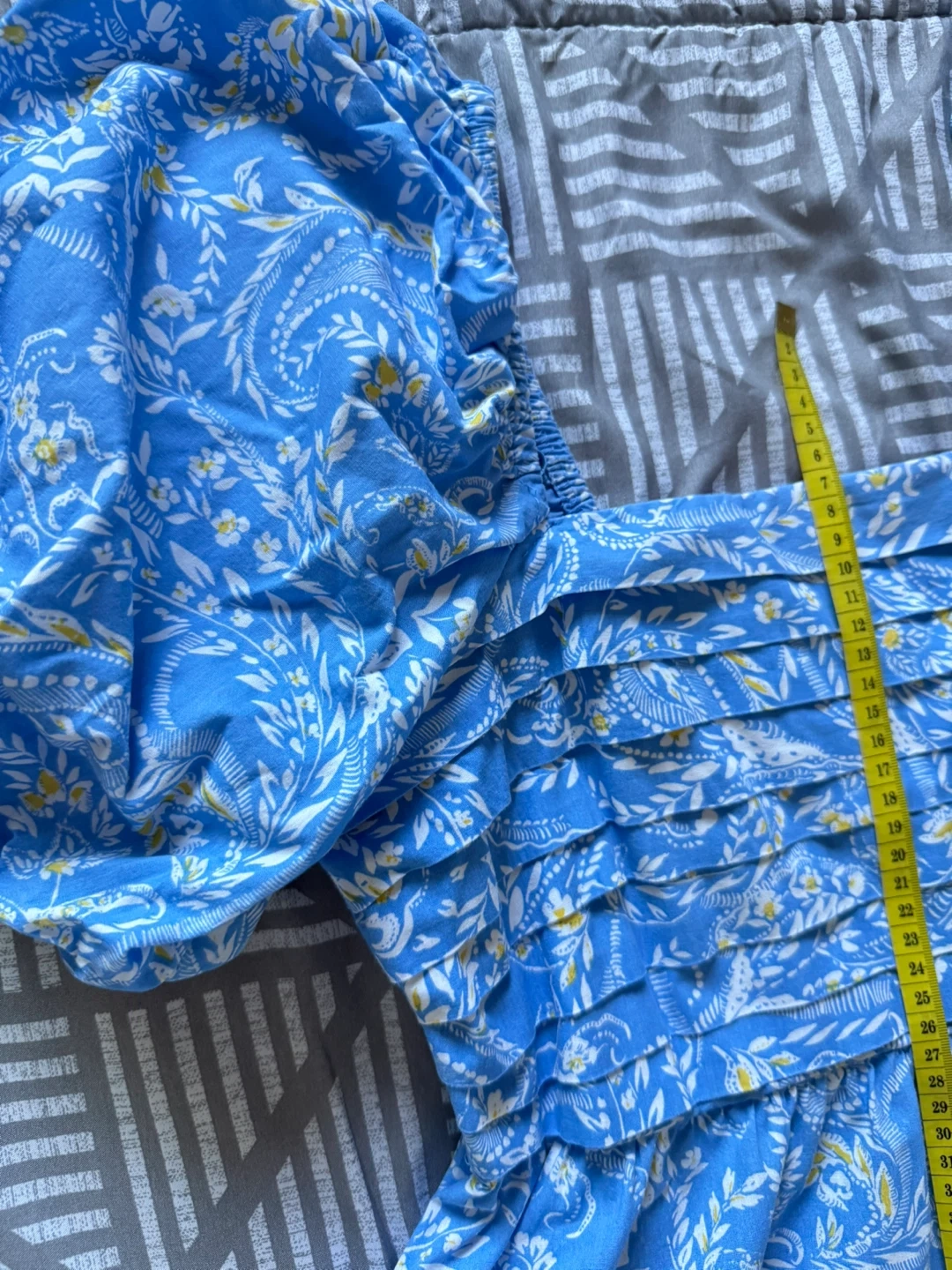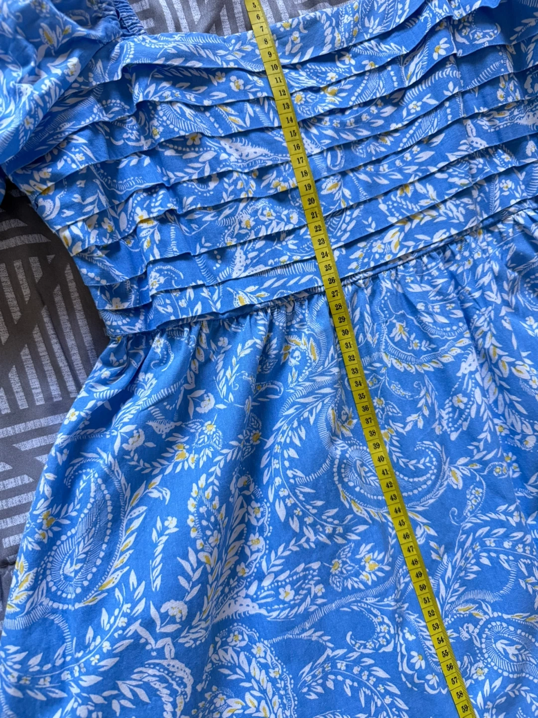 73Cute blue dress with a white and yellow floral pattern. It has a square neckline and short, puffed sleeves. The dress appears to be a size medium, based on the measuring tape in the photos. Great for summer!