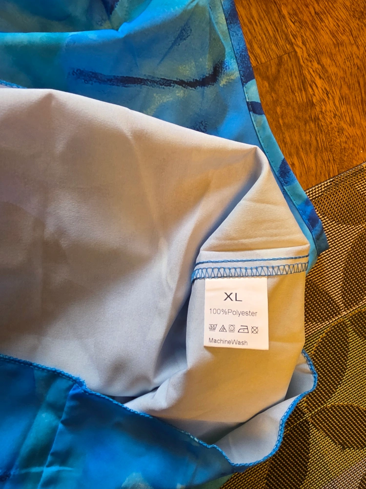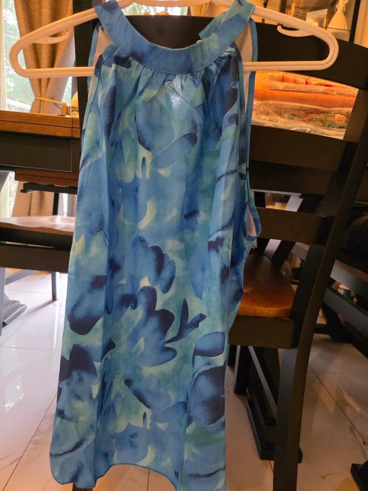 10Here's a lovely blue floral halter top in size XL! It's made of 100% polyester and is machine washable, making it super easy to care for. The design is a beautiful mix of blues, perfect for adding a pop of colour to your wardrobe