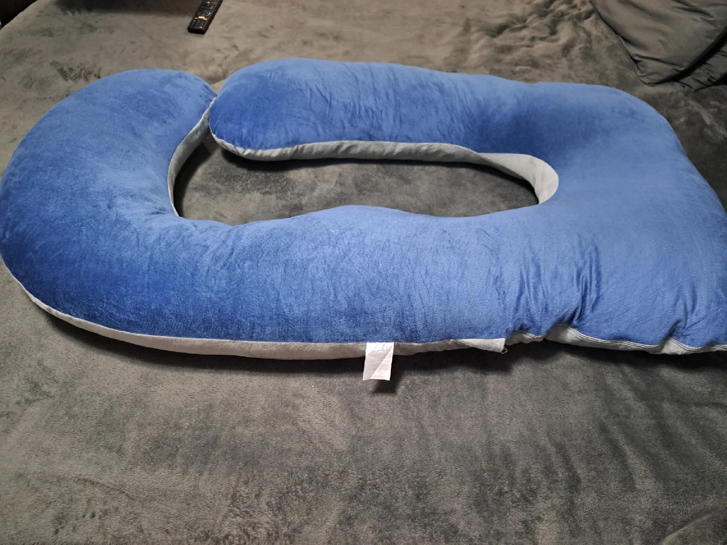 0This full body pregnancy pillow is in great condition and ready to provide comfort and support during pregnancy. It's a blue, U-shaped pillow that helps support your back, belly, hips, and knees while you sleep. Perfect for expecting mothers!