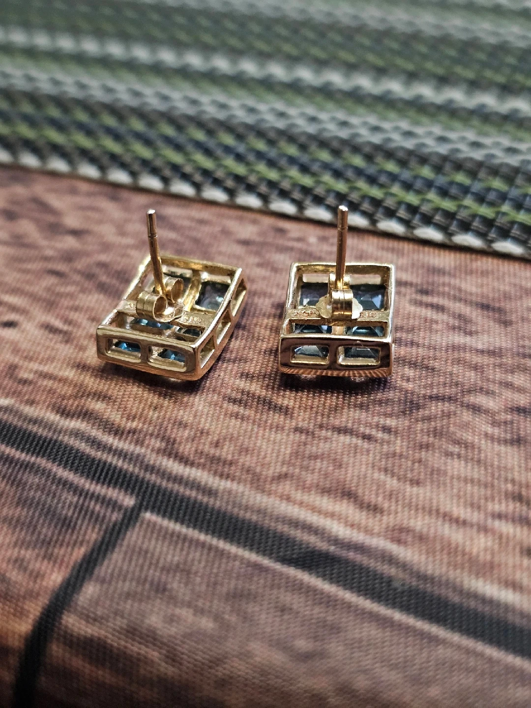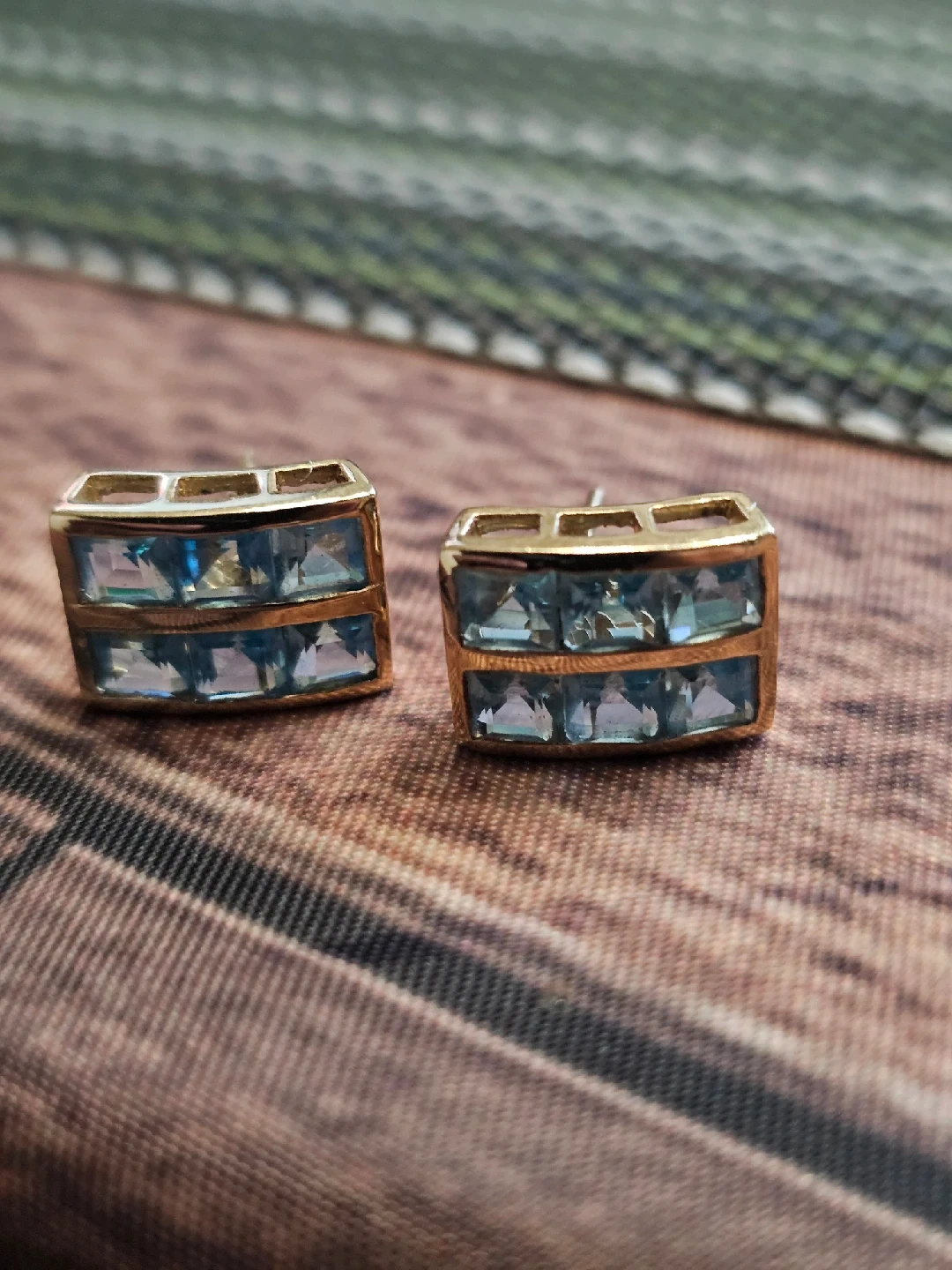 1000+These are a pair of 14K gold earrings featuring blue gemstones. They weigh 4.34 grams. Great for adding a touch of elegance to any outfit!