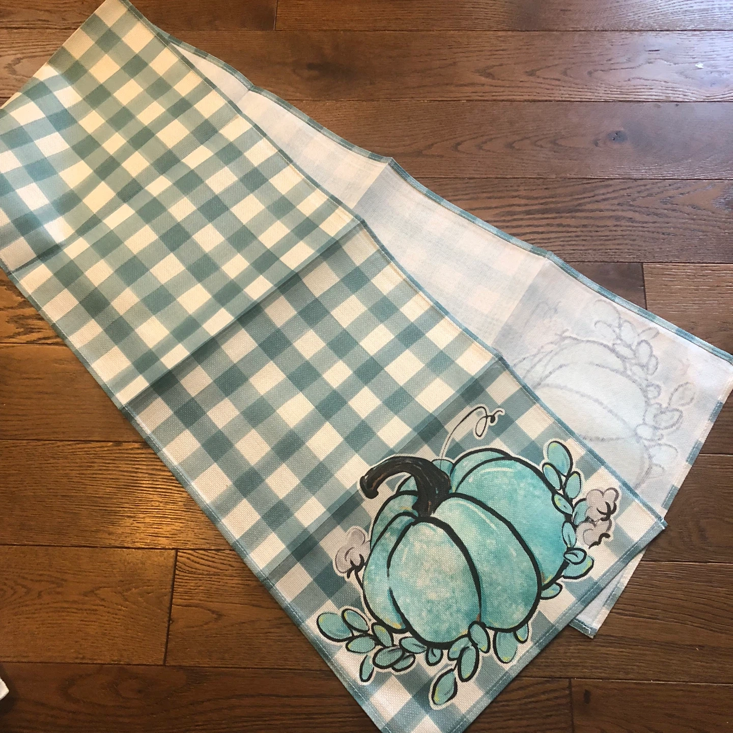 Add a touch of autumn charm to your table with this adorable blue gingham table runner! It features a cute pumpkin design and would be perfect for fall decorating 72”