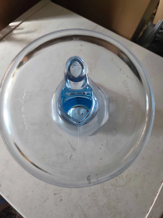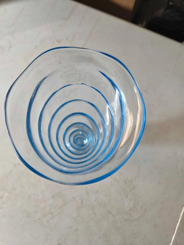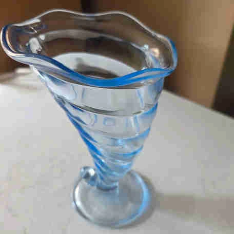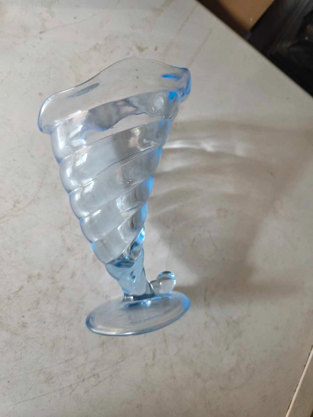 This is a vintage Bormioli Rocco "Cornucopia" glass, also known as a "Fortuna" parfait glass from the 1970s and made in Italy. It's about 7 inches tall with a twisted, pale blue glass body and a clear footed base. The brand "Bormioli Rocco" and "Made in Italy" are embossed on the base. The glass is in excellent condition, showcasing a unique twisted design. It's a charming addition to any kitchen or collection. Still available!