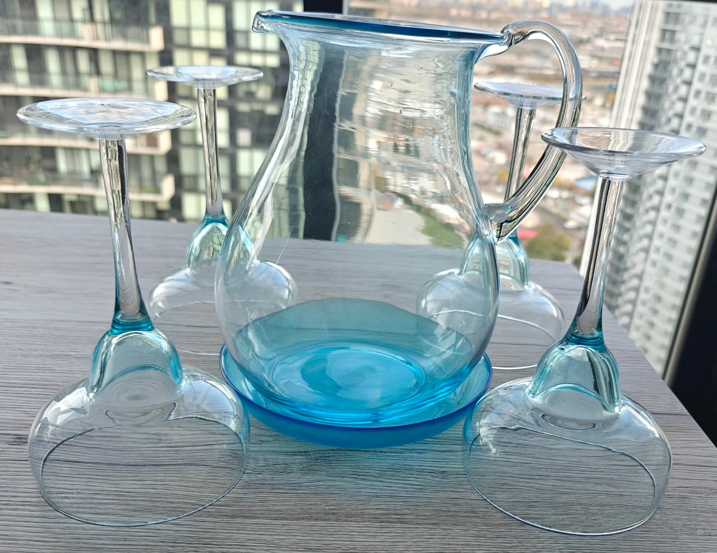 10Selling a beautiful clear glass pitcher with a blue base and rim, along with four matching margarita glasses.