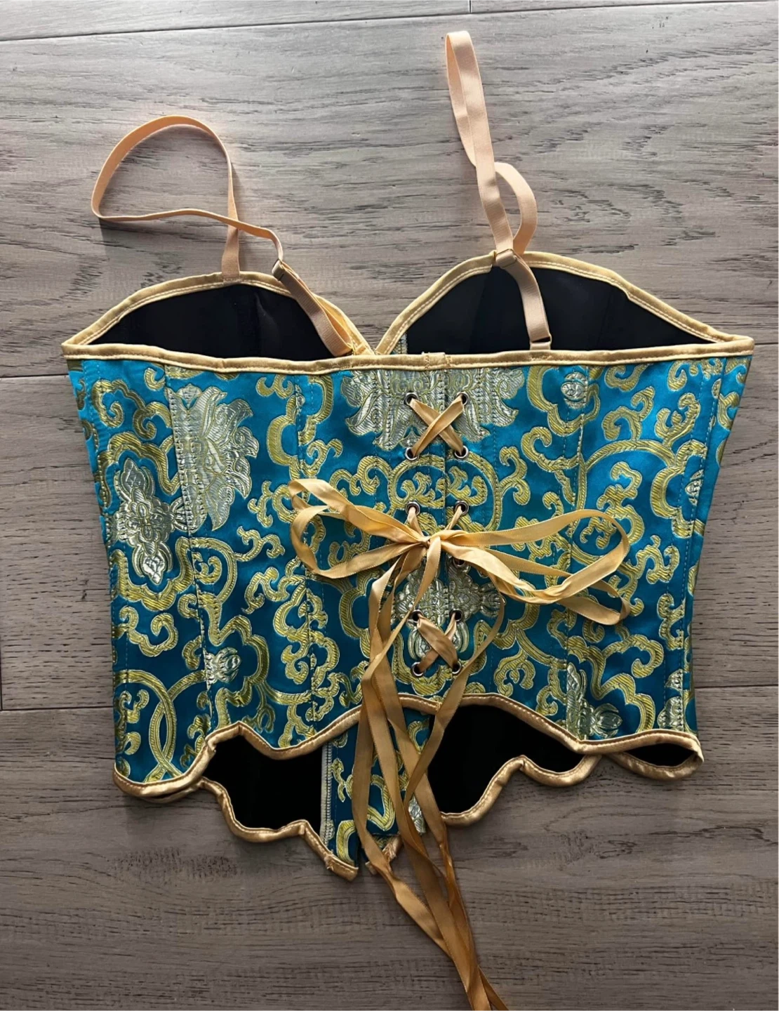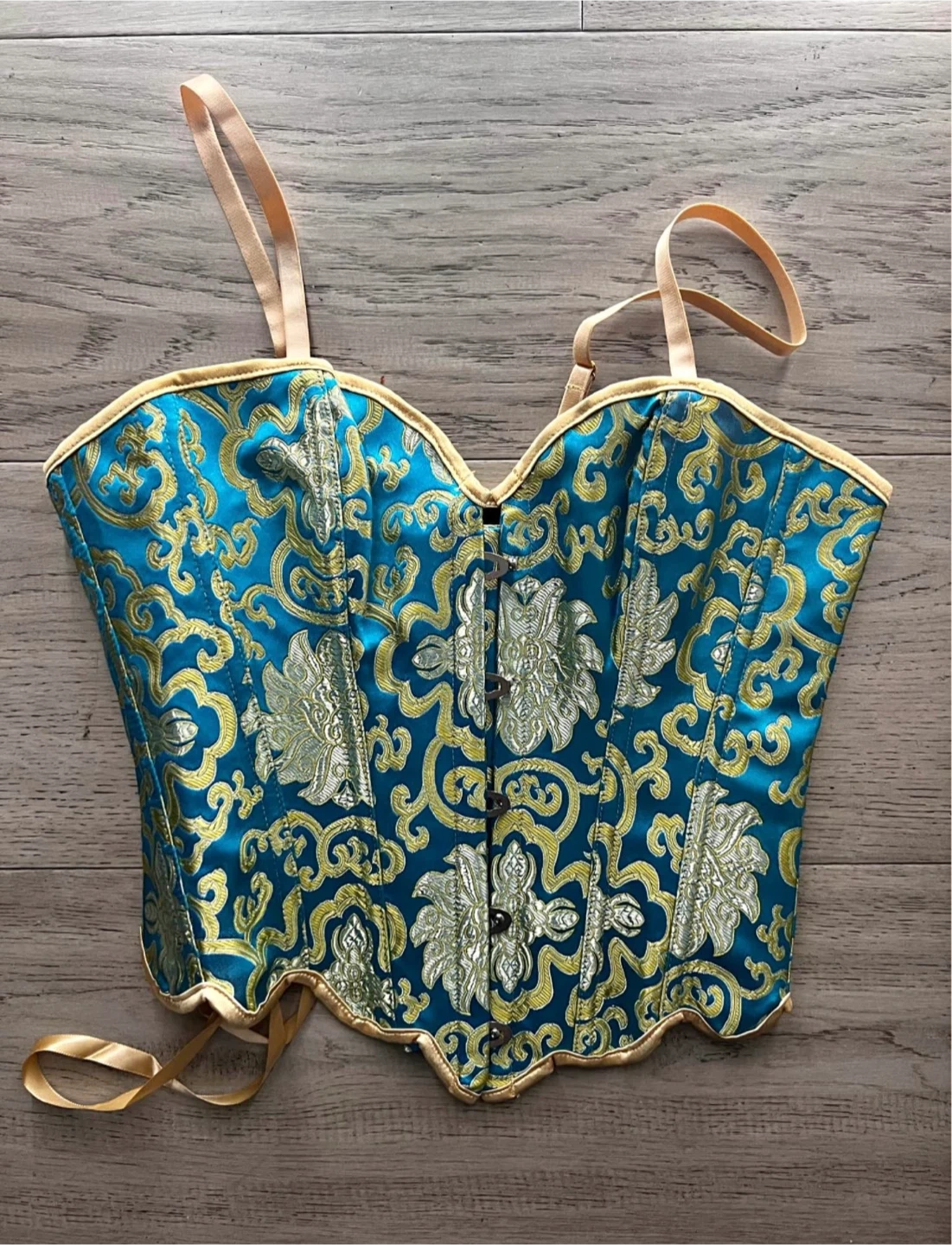 111Selling a beautiful blue and gold corset top. It features a unique pattern and lovely gold trim. Perfect for an event or a Halloween costume!