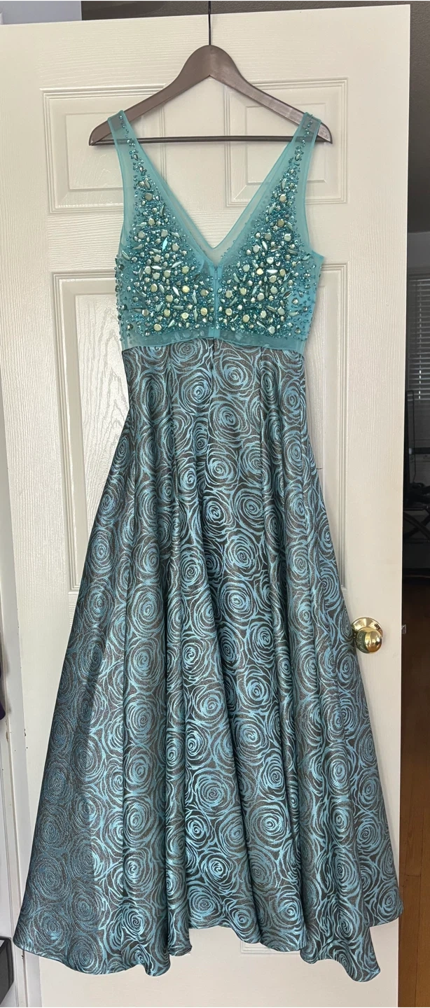 15Selling a beautiful blue gown. It is perfect as an engagement dress or prom dress (if want to look fancy). The top is beaded and the skirt has a rose pattern. It comes with a shiny metal belt that helps shape the waist. It's in great condition and ready for a new owner! I originally bought it for $1500
