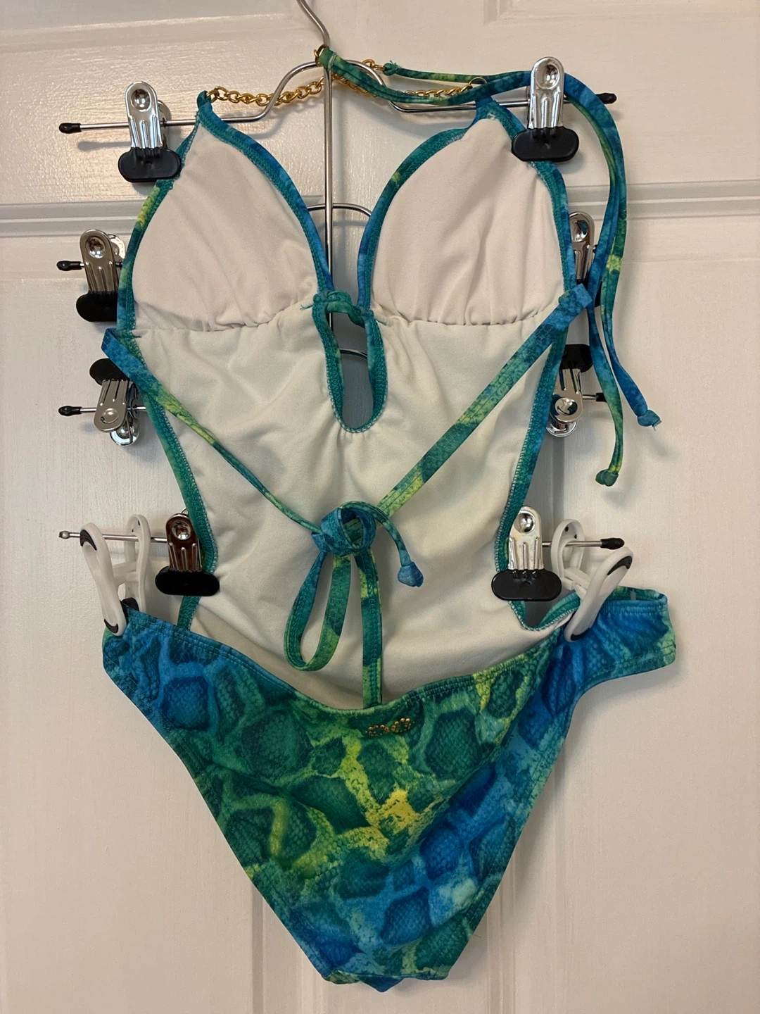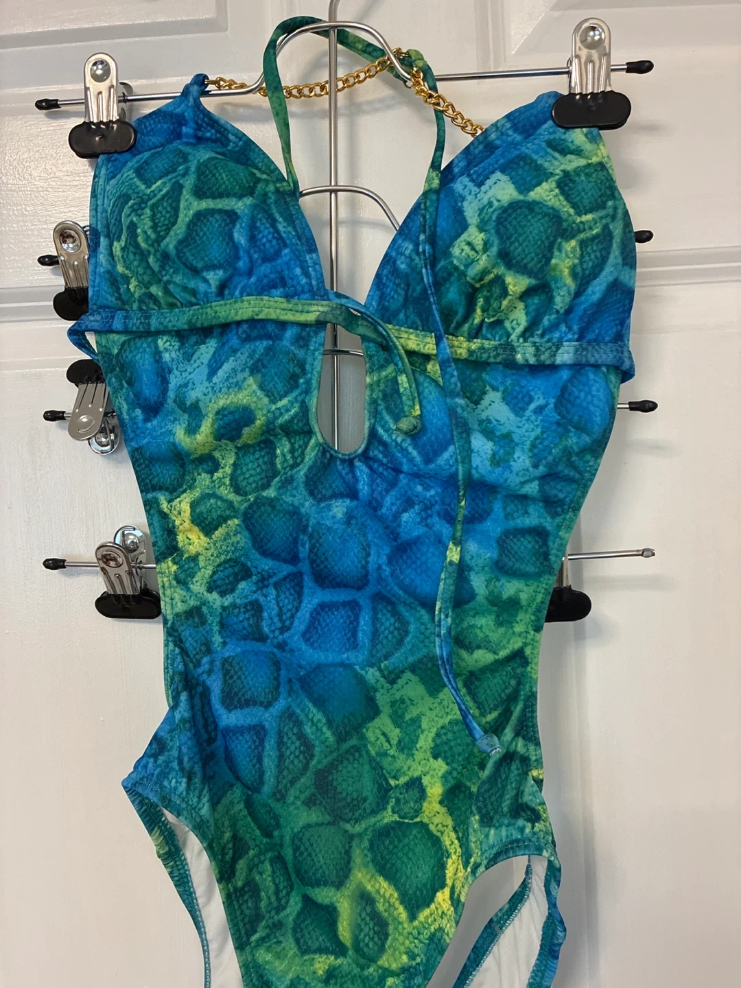 118Cute one-piece swimsuit with a blue and green snakeskin pattern! It has a halter top with a gold chain detail and a tie at the front. The back has a criss-cross tie closure. Perfect for summer!