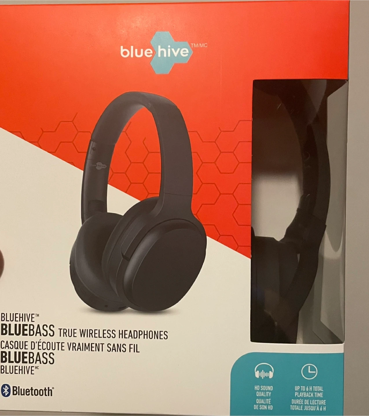 Selling a brand new pair of Blue Hive BlueBass True Wireless Headphones! They are still in the box and have never been used. Key features include: - HD sound quality - Up to 6 hours of playback time per charge - Foam ear pads and adjustable slider for optimal fit - Foldable design - Built-in mic for hands-free calling - Auxiliary cable included - USB-C charging cable included