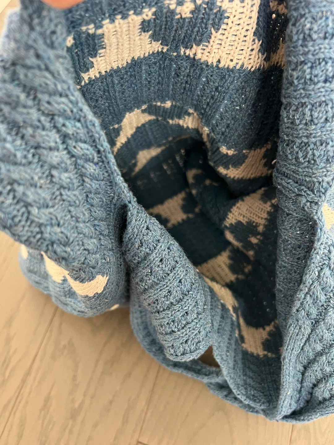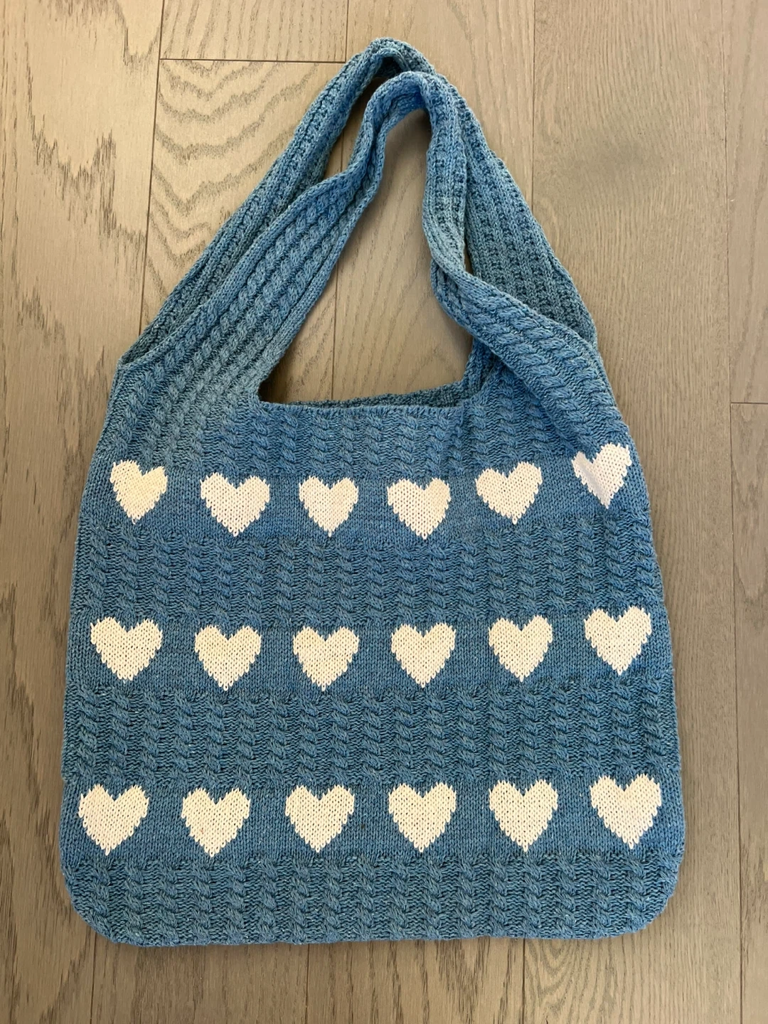 83Cute blue knitted tote bag with white hearts! Perfect for carrying your essentials in style. The knitted texture adds a unique touch to this everyday bag