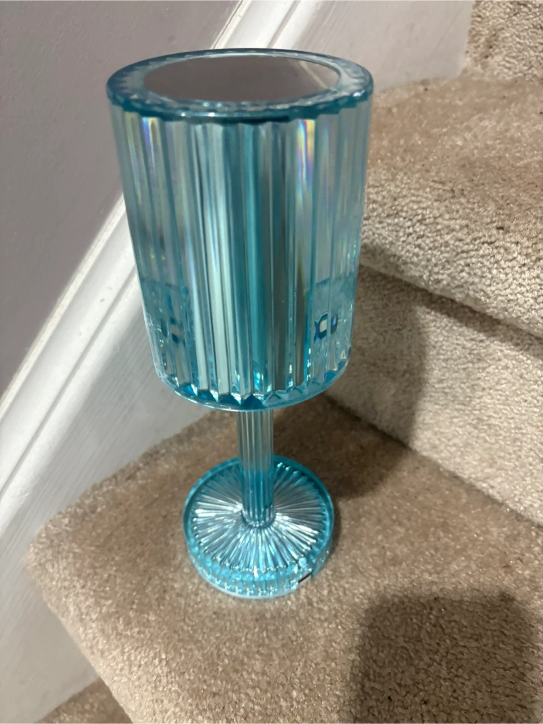 18Blue lamp , can be turn on with the touch of hand . Recharge it cable , It's in great condition .