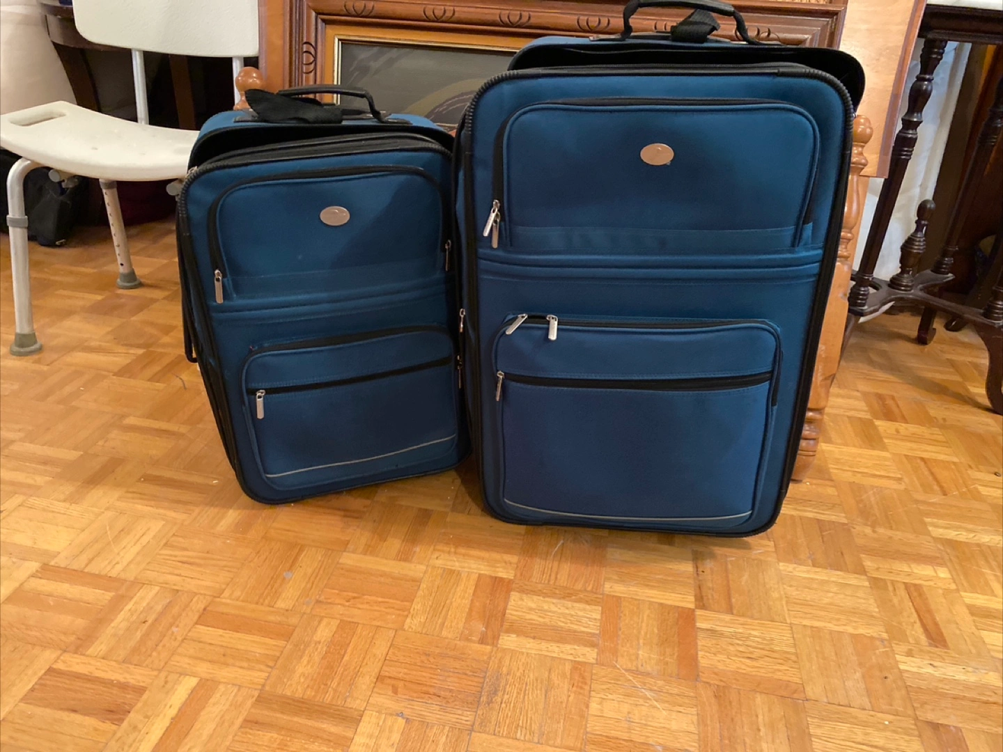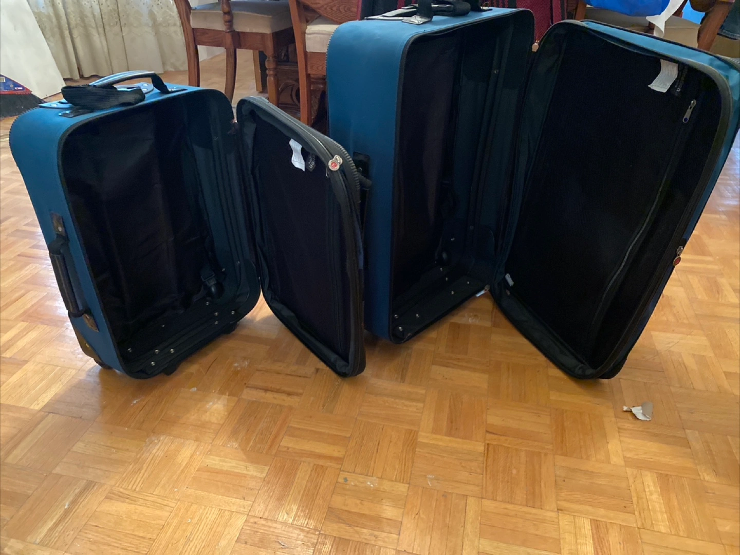 Two blue suitcases in good condition. Perfect for your next trip! The set includes one larger suitcase and a smaller carry-on size. They're ready to pack and go