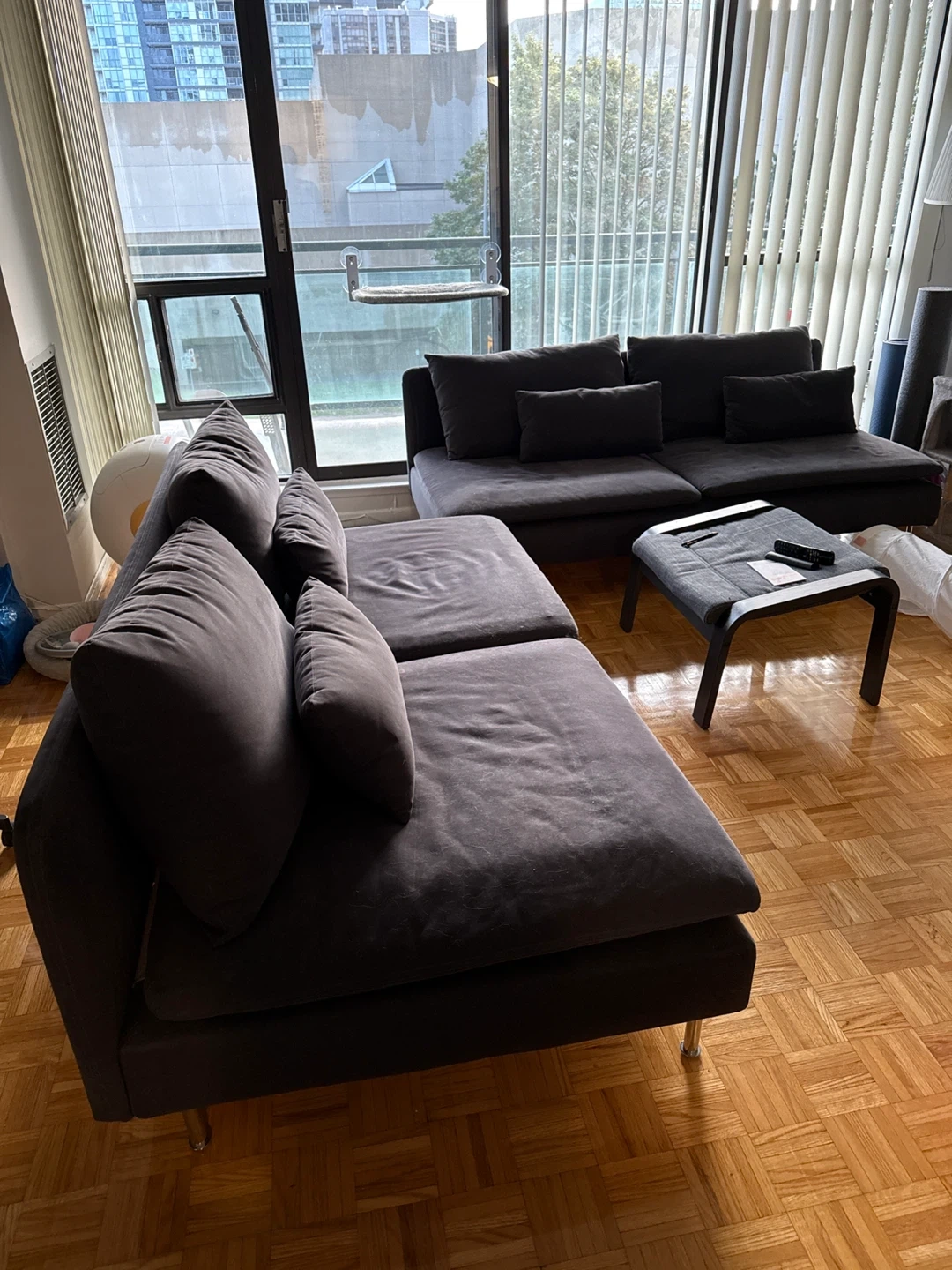 Selling two comfy blue modular sectional sofa! It's in great shape and ready for a new home. Perfect for lounging and movie nights! Cushions are lose for better adjustment and easier cleaning.