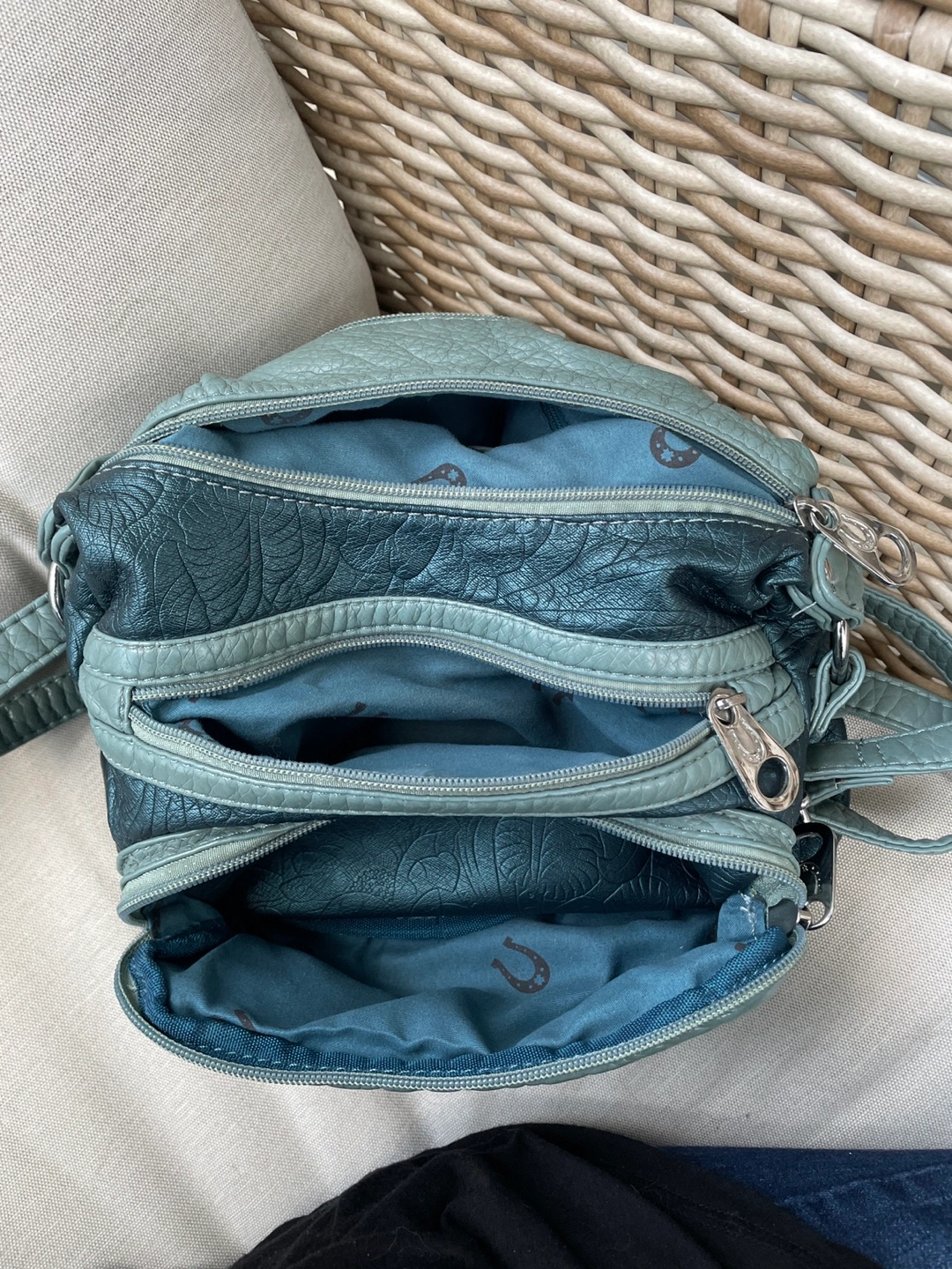 This is a cute 2 tone Aqua shoulder bag with lots of pockets! It's perfect for keeping everything organized and easy to find. The colour is a nice, muted blue that goes with everything. Cute silver style hardware. Please text 5872062974