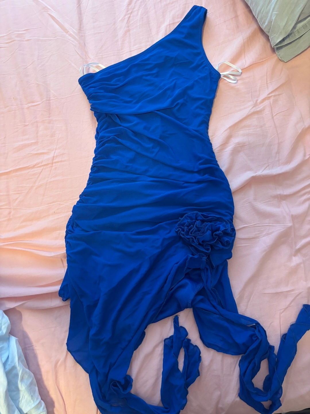 25Selling a stylish blue one-shoulder dress. It features a unique design with ruching and a floral accent. Perfect for a special occasion or a night out!