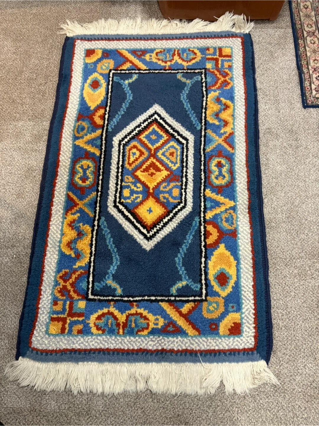 A lovely handmade plush blue rug with a unique patterned design. It's in great condition and would add a pop of colour to any room Pet & smoke and pest free home Bloor and Keele area Pick up by appt