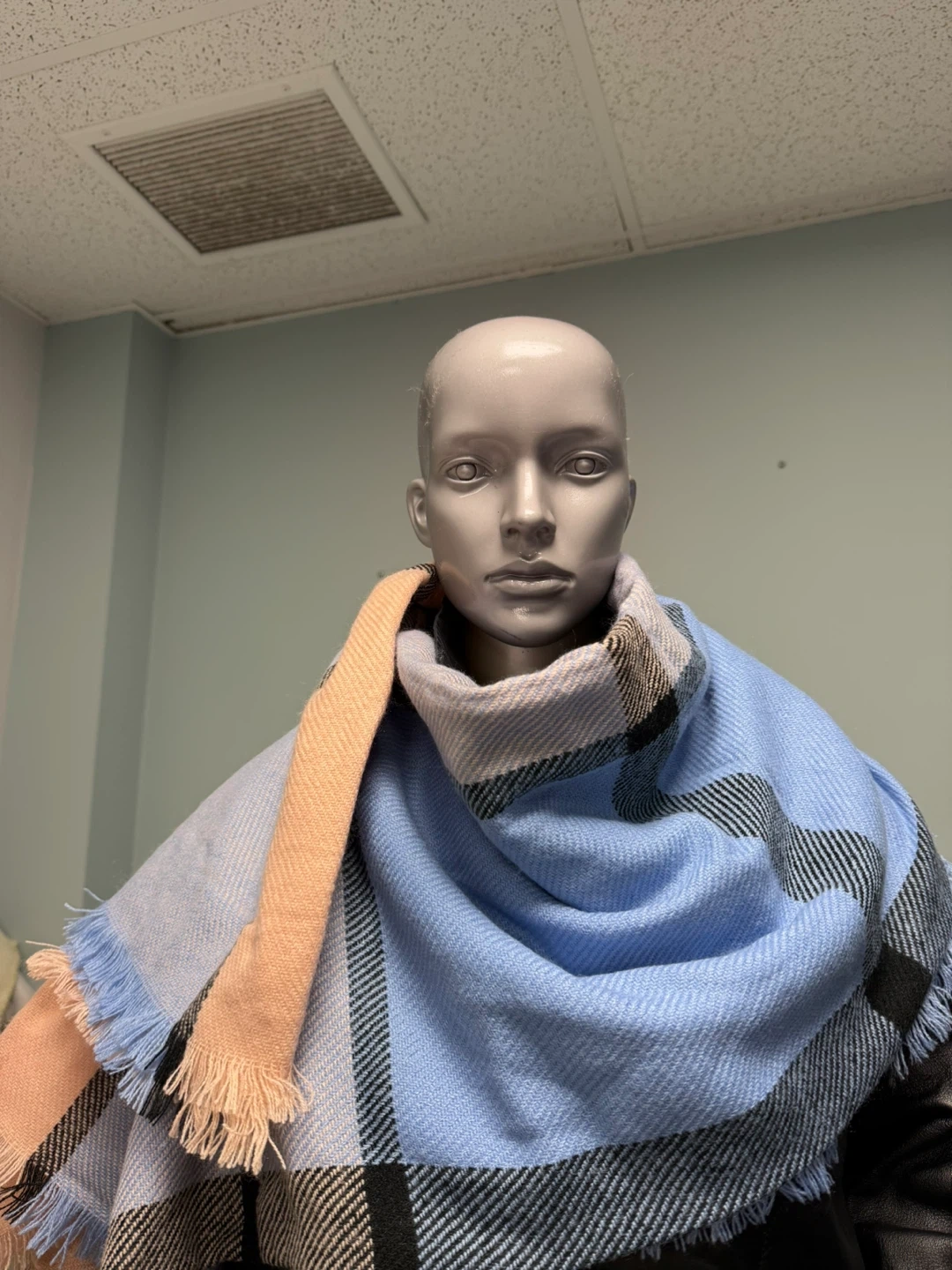 5A cozy peach and blue plaid scarf with a fringed edge. Perfect for adding a touch of warmth and style to any outfit! Pickup on Ottawa Street between 9-4pm, Monday-Wednesday or Friday! See our other listings for more items! 2510W1238