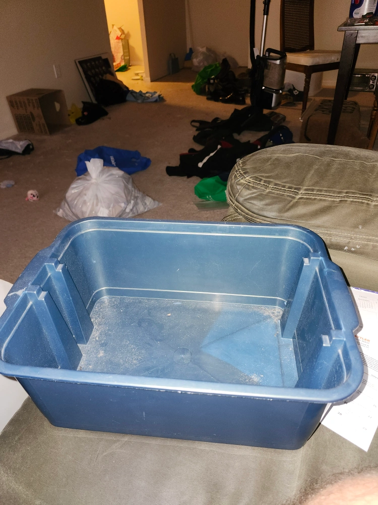 40Selling a blue plastic storage bin. It's a great size for organizing items around the house or for moving things around