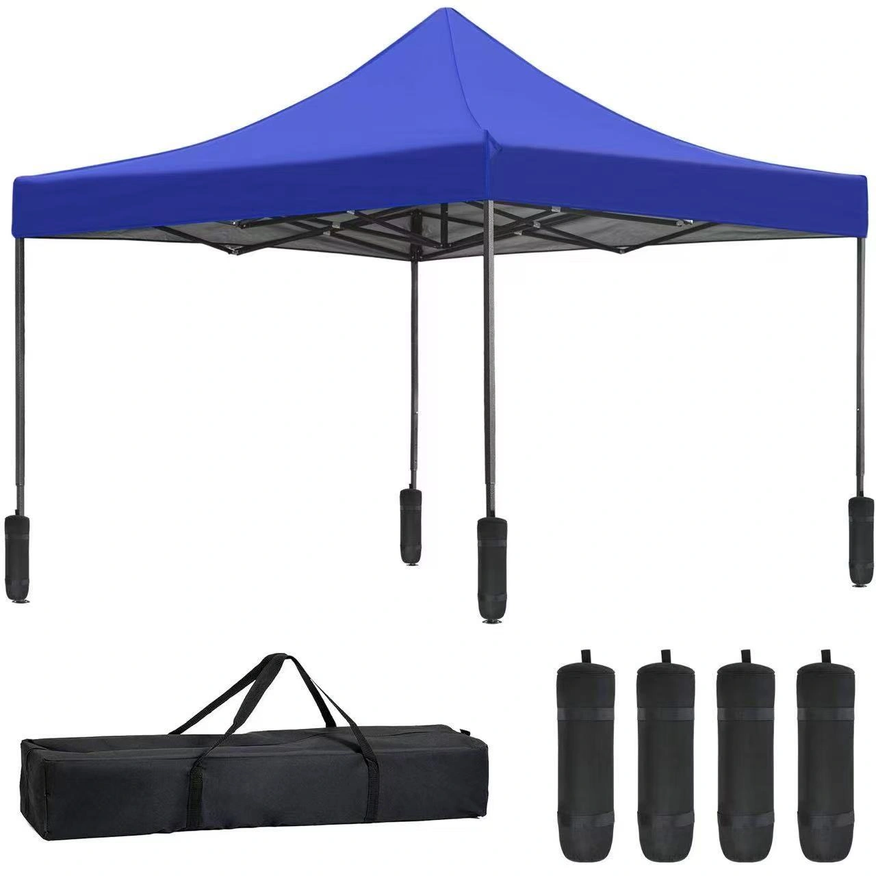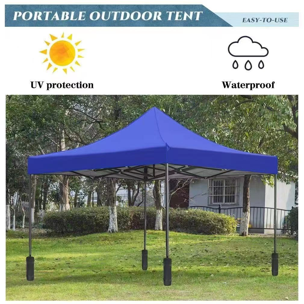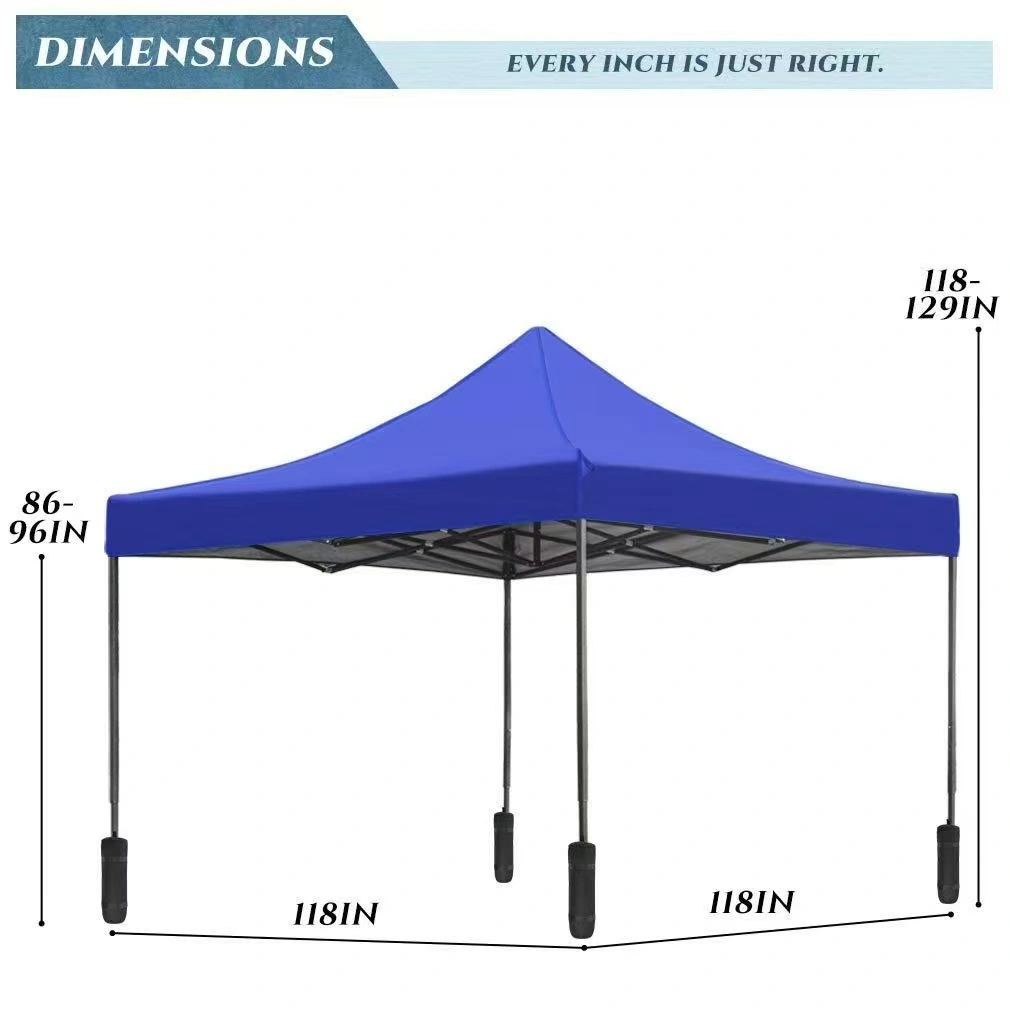 This portable outdoor tent is perfect for any outdoor event! It's easy to set up with its pre-assembled steel frame. The dimensions are 118x118 inches at the base and the height is adjustable from 86 to 96 inches. The tent also features UV protection and is waterproof. It comes with a carrying bag and sandbags for added stability