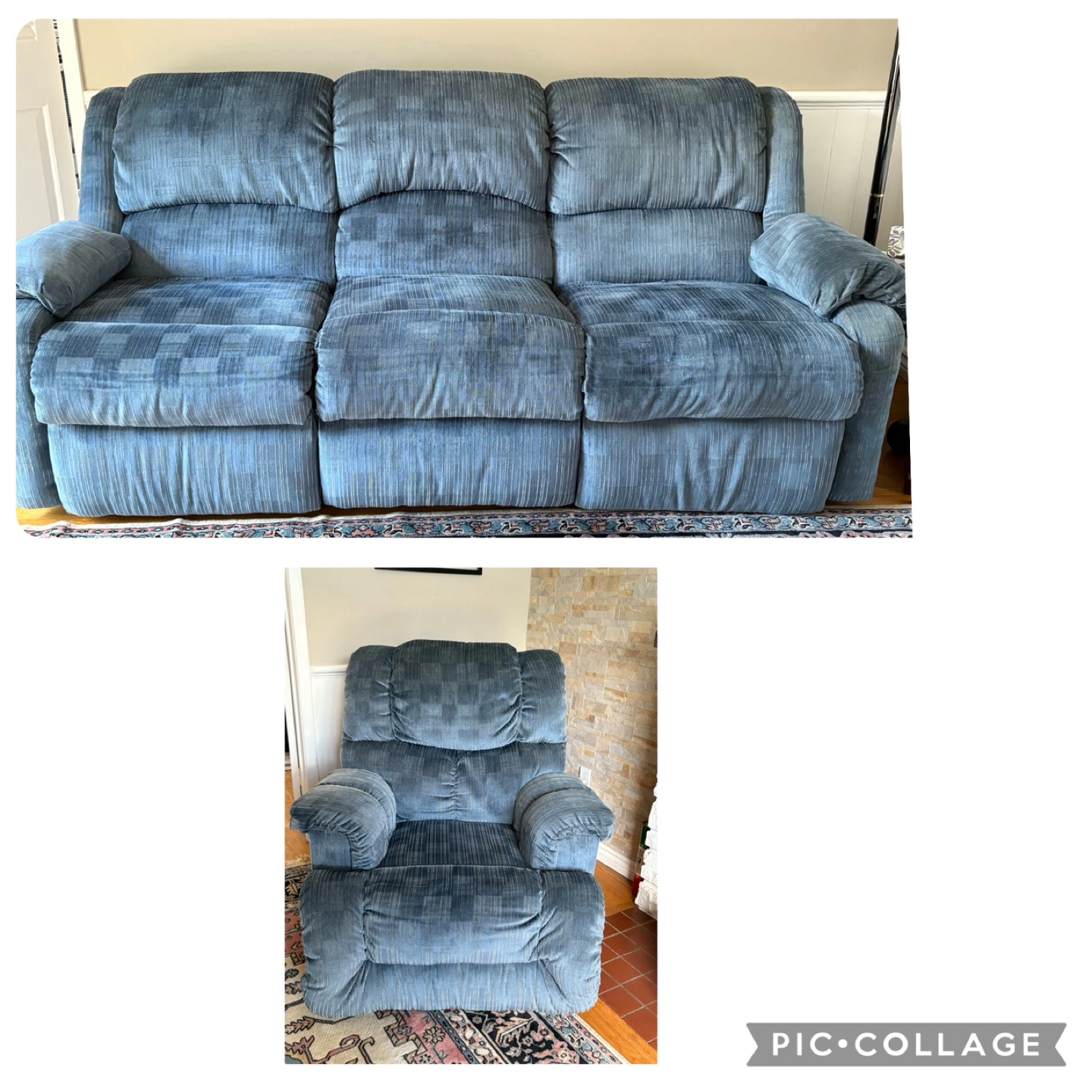 A great addition to any home. This reclining sofa and chair set is incredibly comfortable, perfect for relaxing after a long day. This set includes a three-seat sofa and a matching reclining rocking chair, both in a durable, soft, blue fabric. Key features include: * Smooth reclining mechanism * Very clean, in a smoke free home * Durable upholstery and strong frame * Comfortable padding
