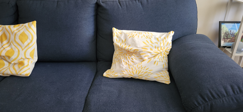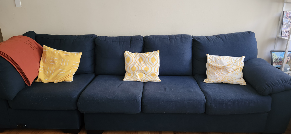 Navy blue sectional sofa. Includes three throw pillows. In good condition. 4 seater. very comfortable. no tear or damaged parts. detachable