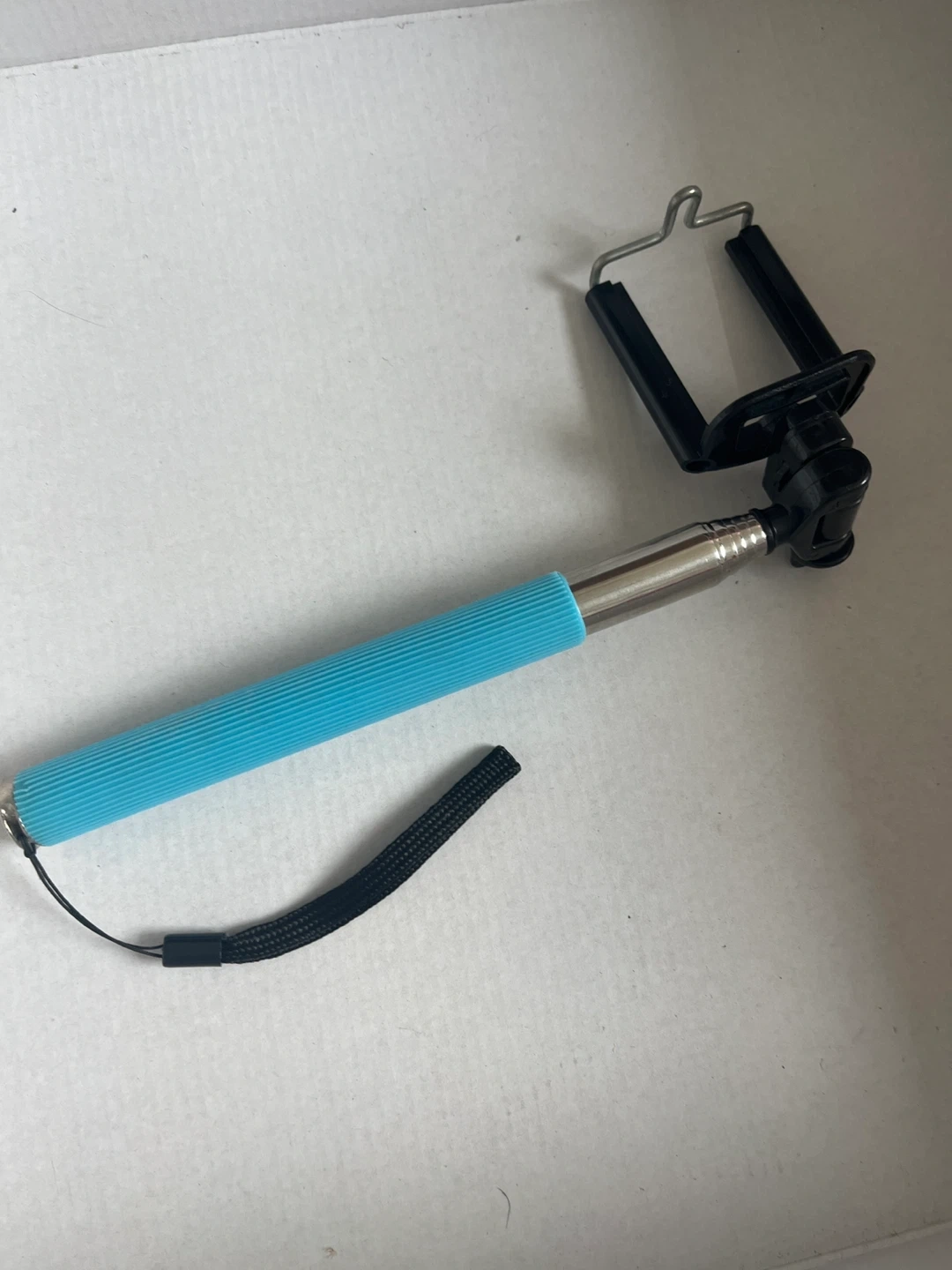 65Selling a blue selfie stick tripod! It has a phone holder at the top and a wrist strap. Great for taking photos on the go