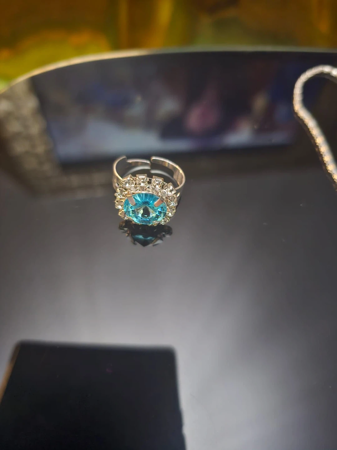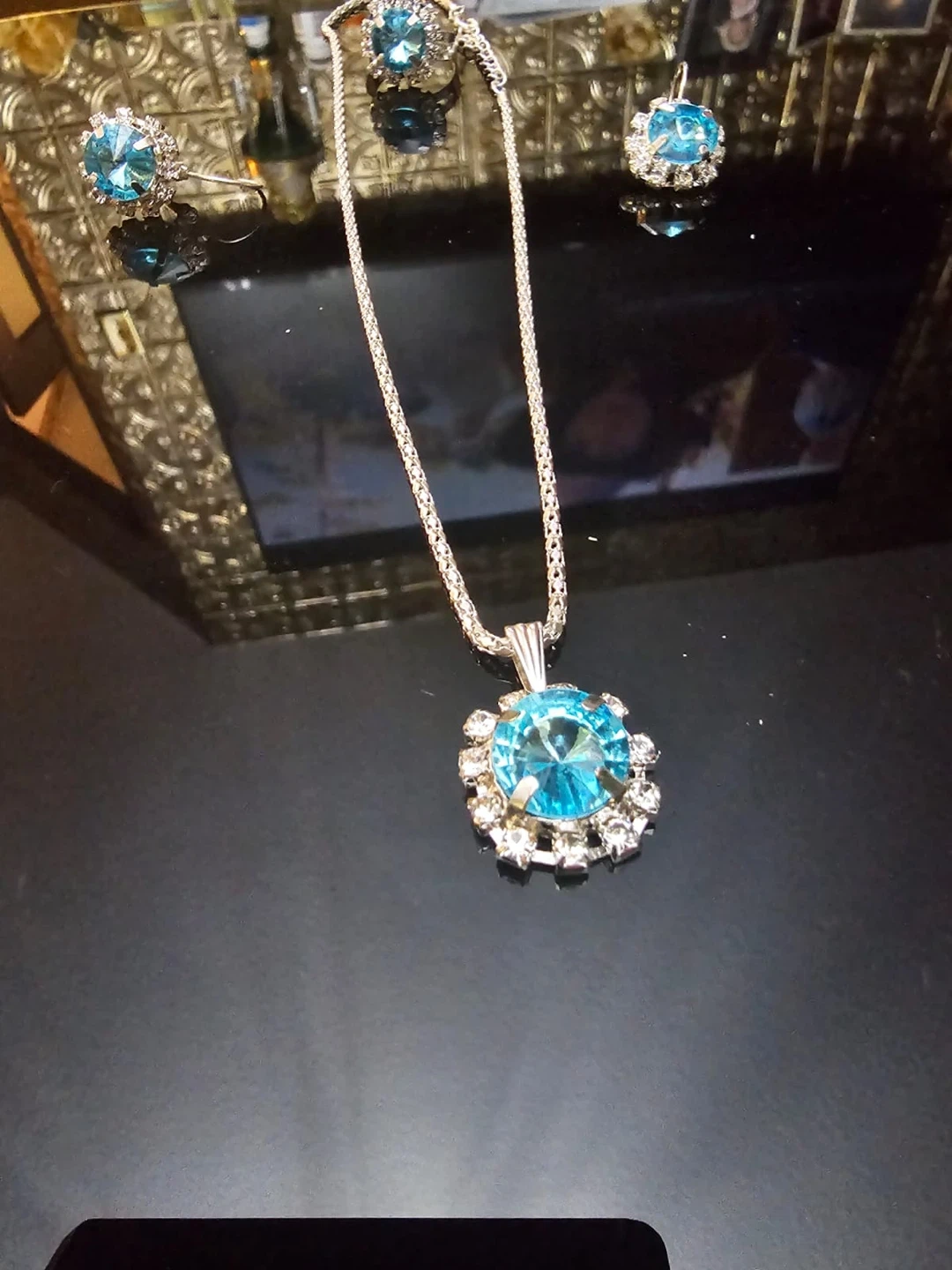 9A beautiful matching set of blue stone jewellery, including a necklace, ring, and earrings. Perfect for dressing up any outfit!