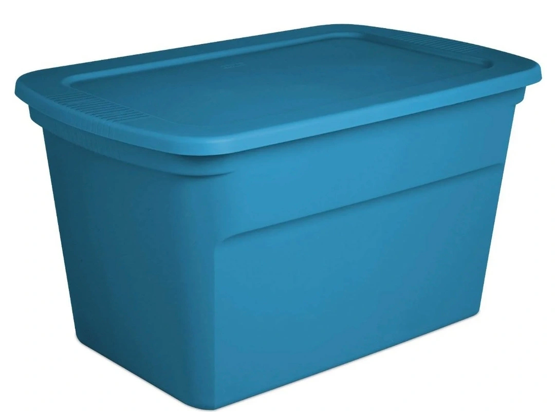 47Here's a sturdy blue storage tote with a lid! Perfect for organizing your belongings and keeping them safe and dry. Used