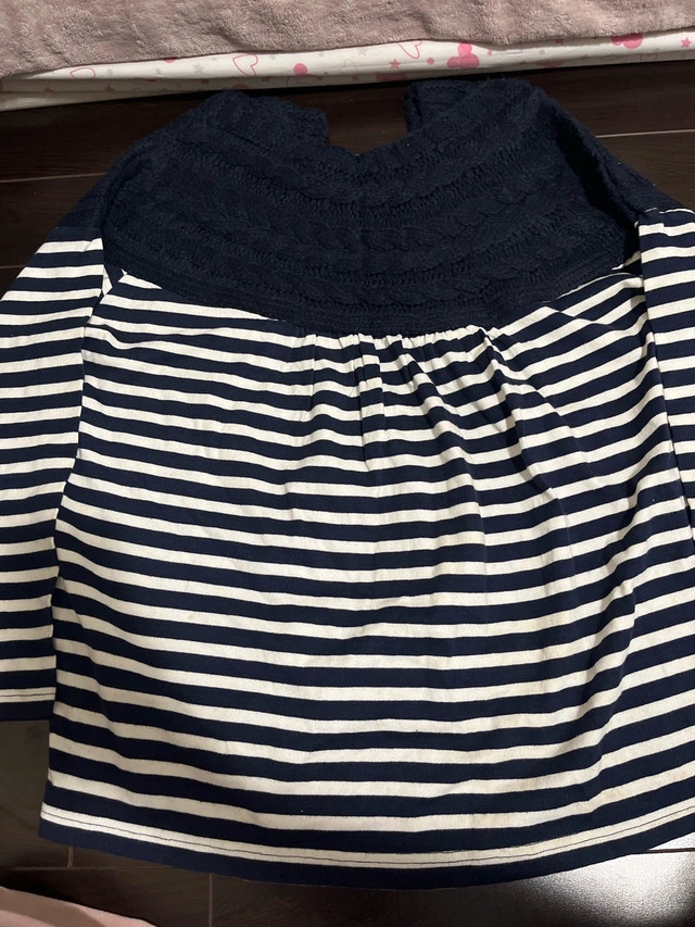 Not used at all Women's blue striped sweater, featuring a unique knitted collar and long sleeves, perfect for adding a stylish touch to any outfit. The sweater is in good condition and ready for a new home. * Colour: Blue and white stripes with a dark blue knitted collar * Sleeve Length: Long sleeve * Size: Approximately a women's Medium