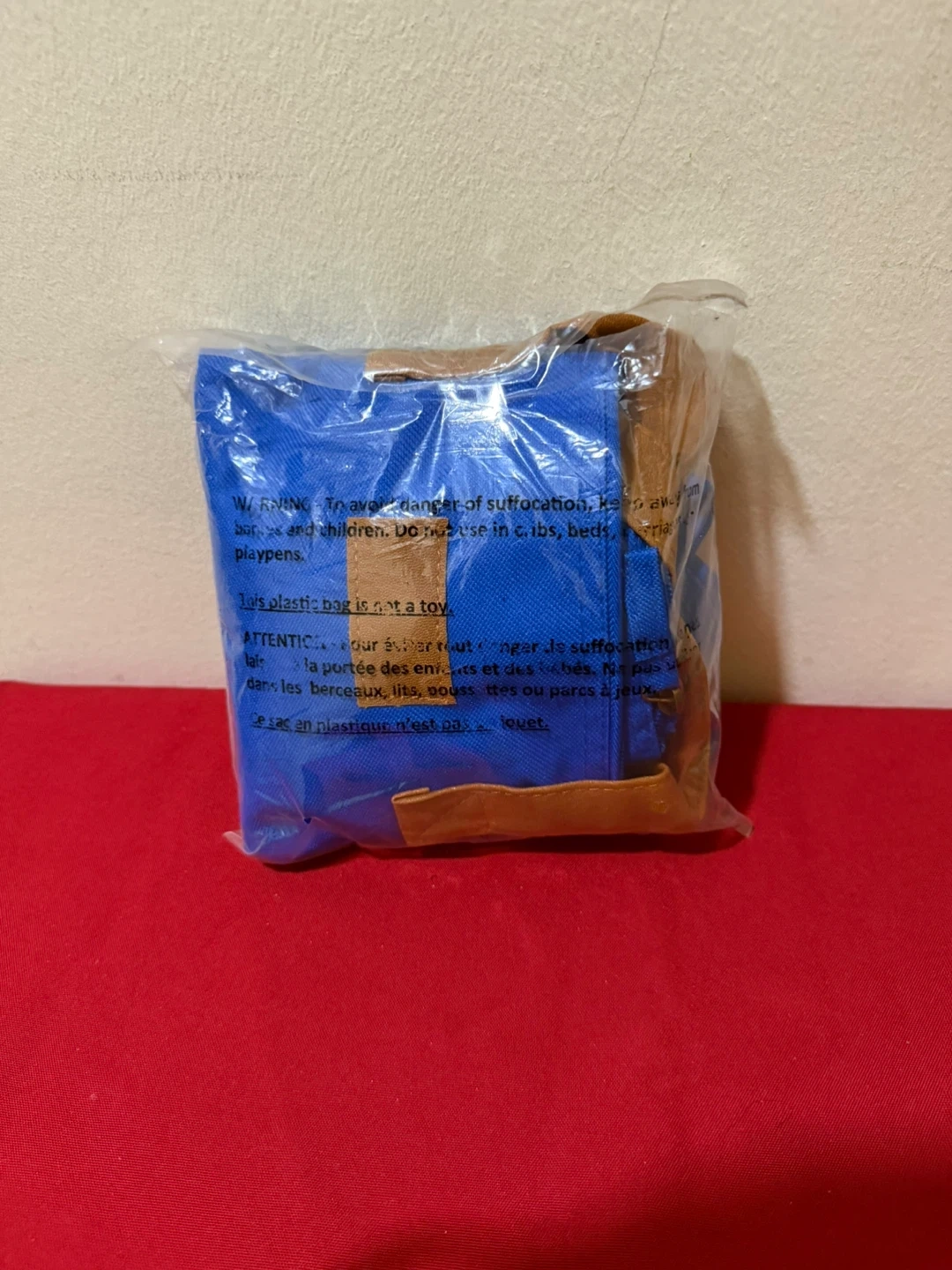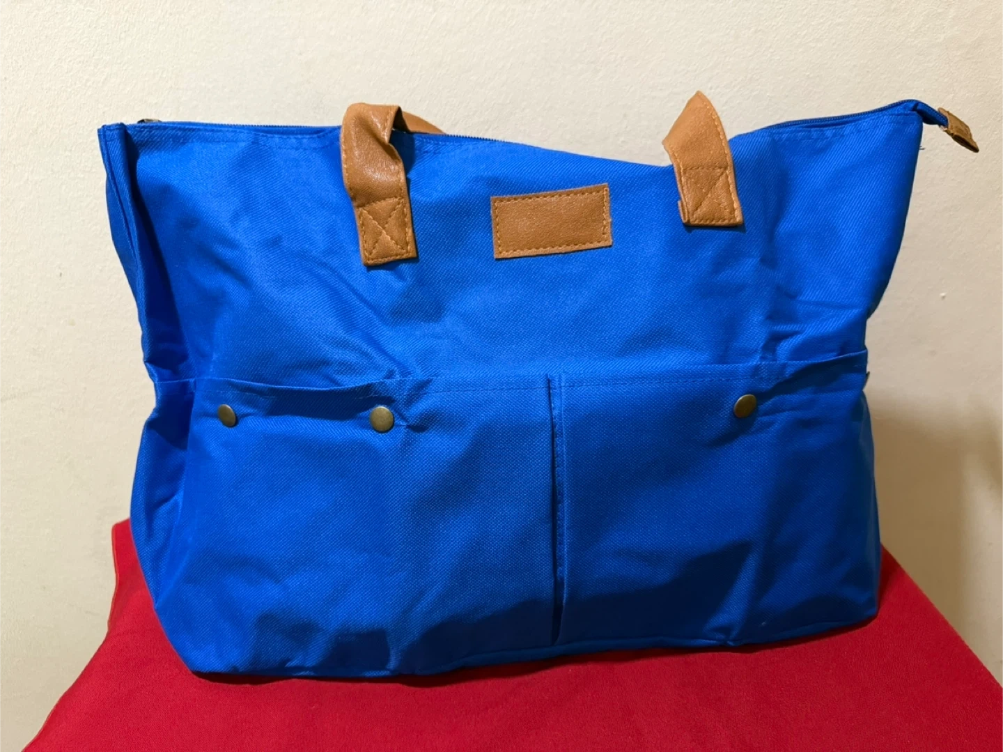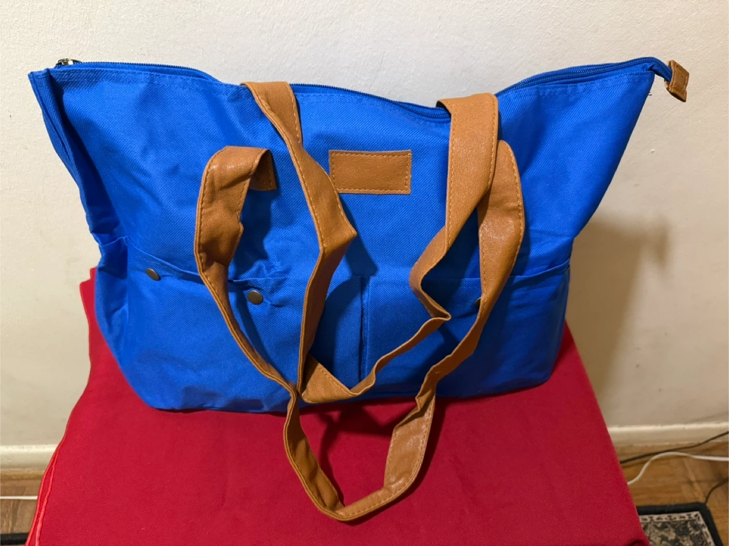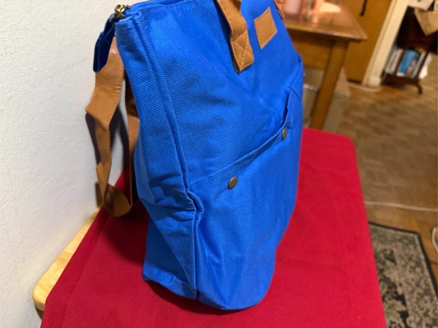 This is a blue tote bag with brown straps. It features a zippered top and two front pockets with snap closures. It's in great condition and ready for a new home!